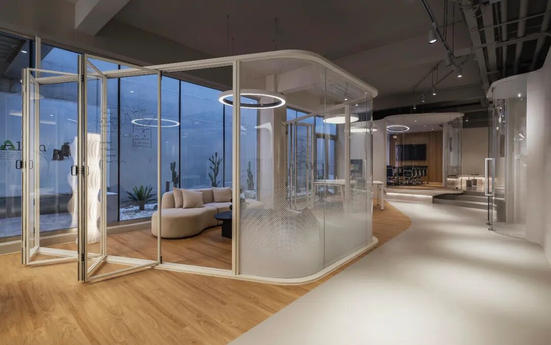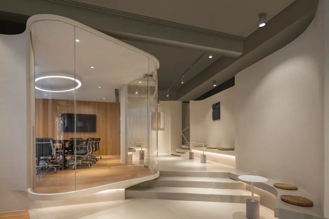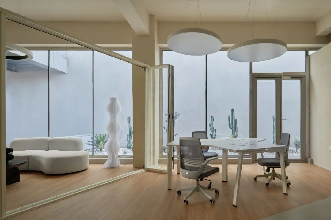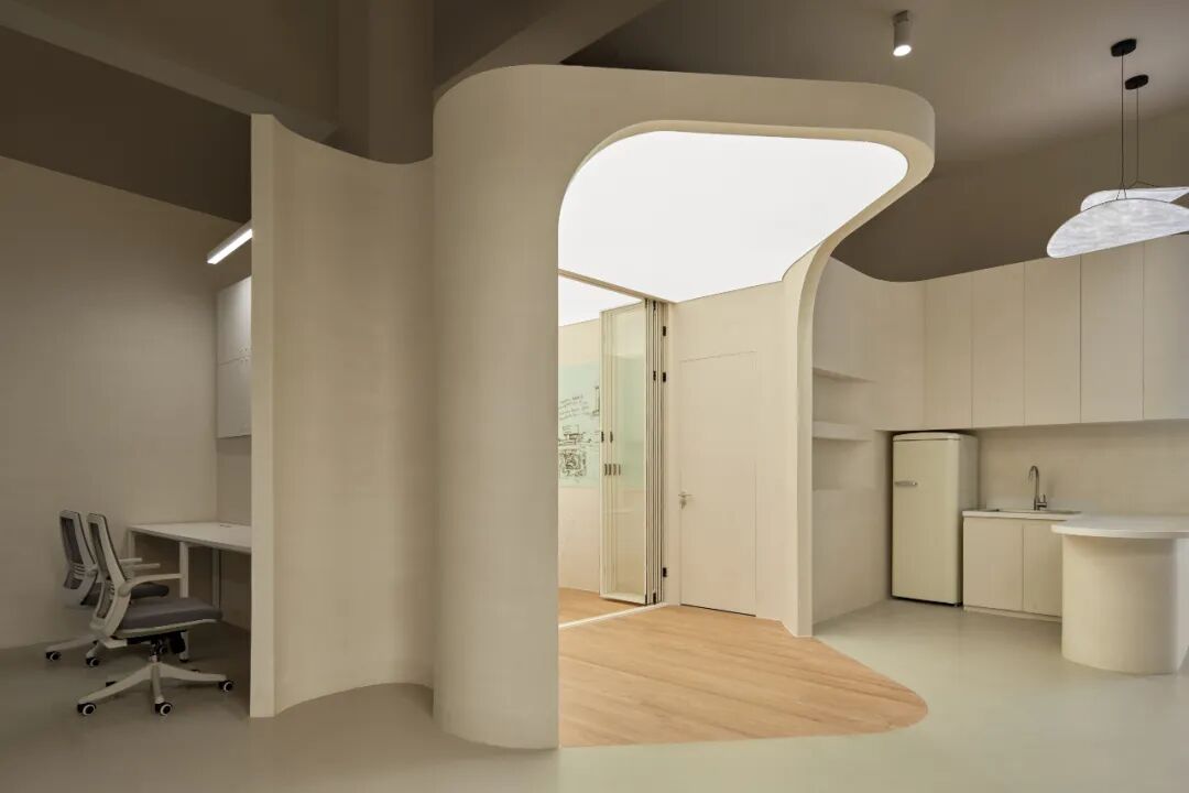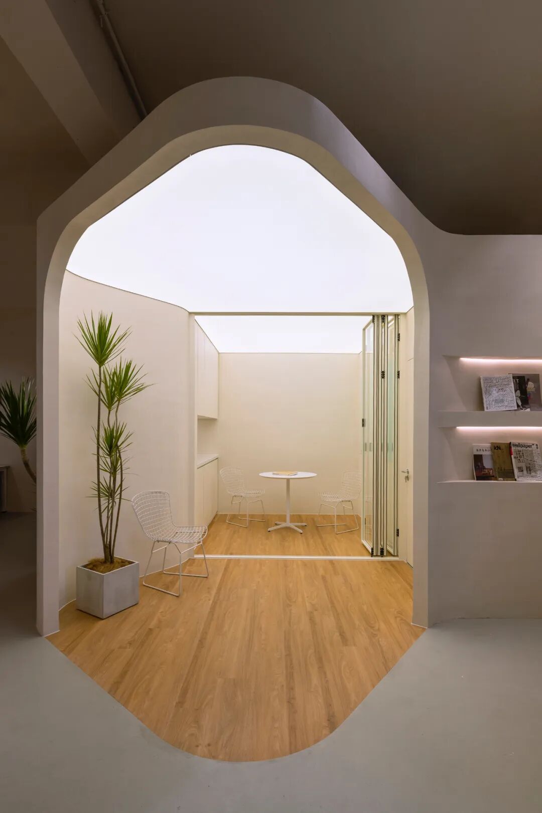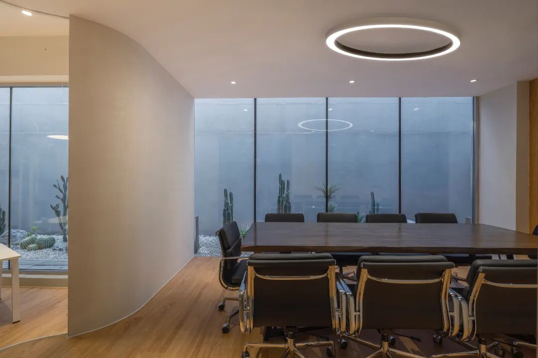 视丘道办公空间位于一个180平米的狭长空间里,南侧比邻小花园。里外工作室将有咖啡厅氛围的茶水间和企业荣誉墙放置于空间入口处。结合茶水间,设置可开放可封闭的小型讨论区,与茶水间设施形成联动。