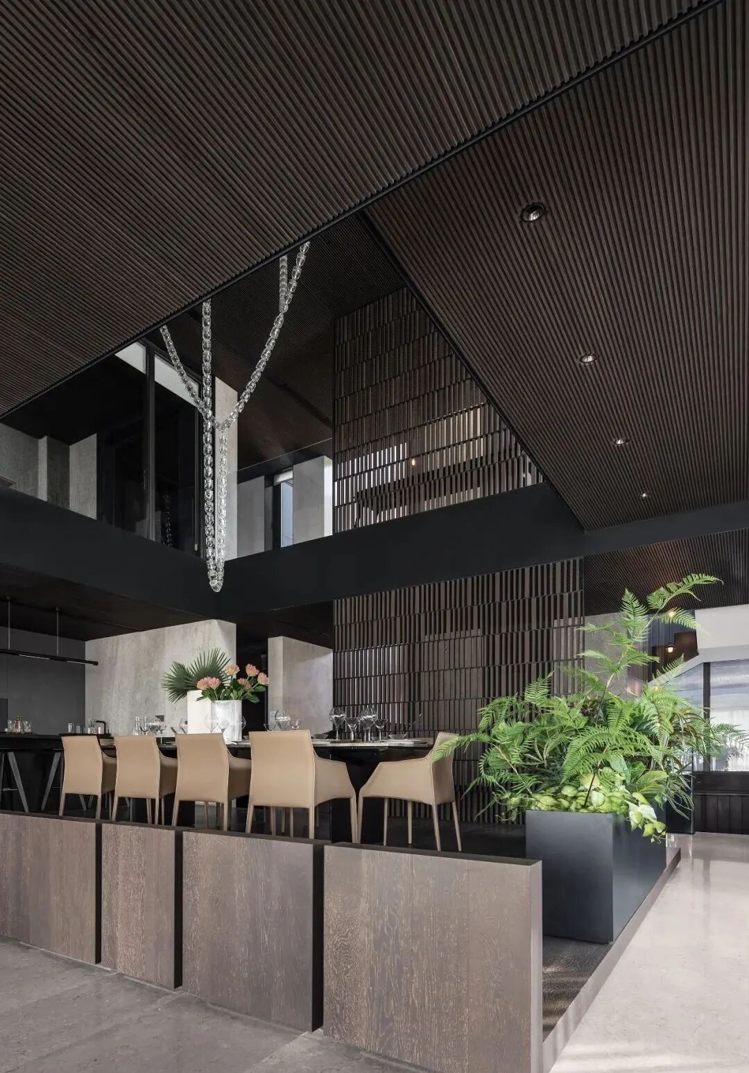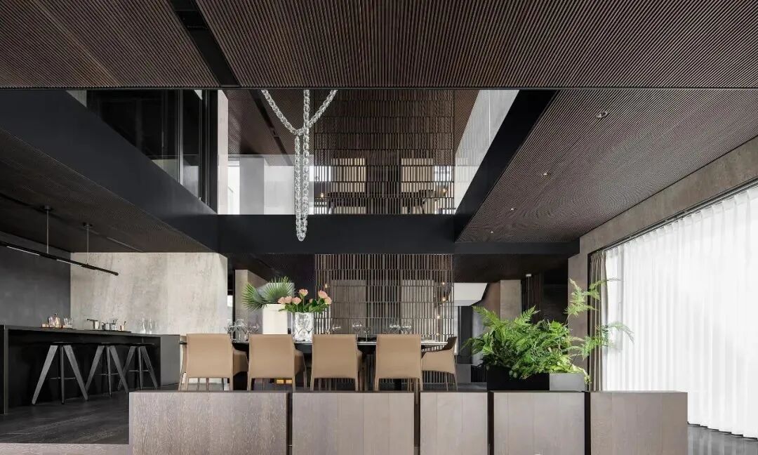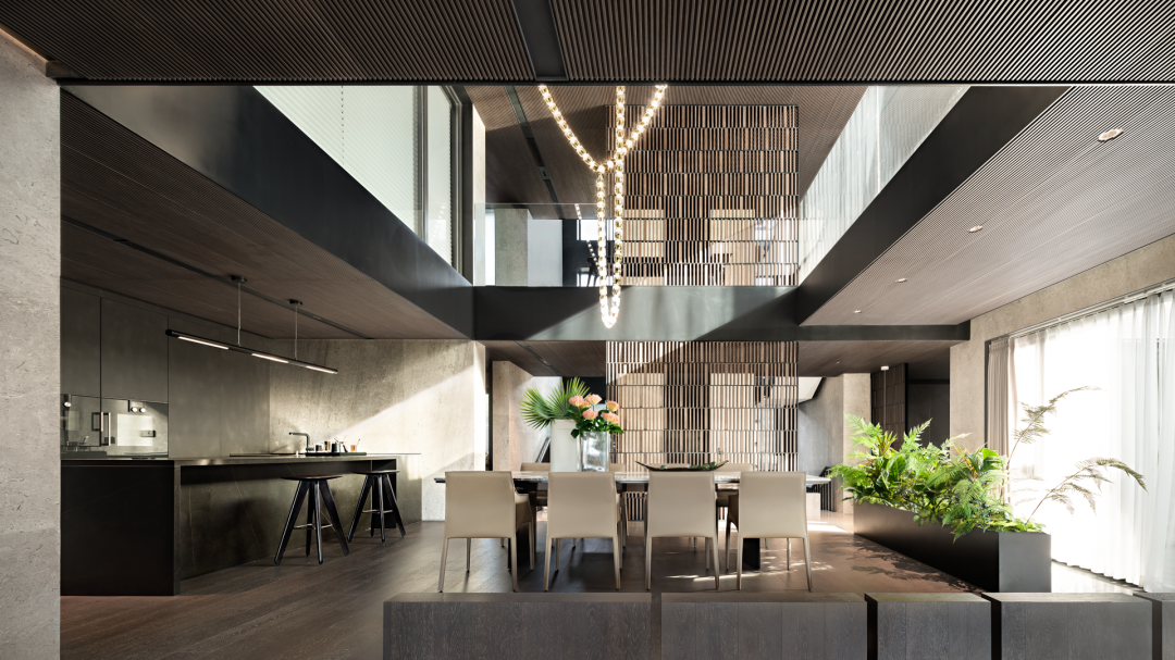 但这只是“引湖入室”的序曲。整套房子的开间做到了约17.6米,犹如“超宽屏取景器”。2楼很特别地在餐厅上空挑高,地面还特意抬高约25公分,为了“一家人吃饭时可以看到湖景”。