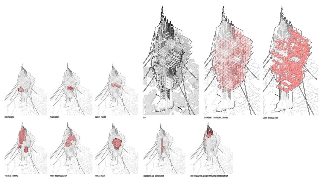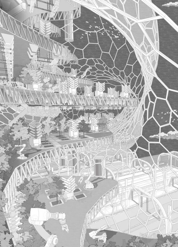 该项目设计出了一个可自我维持的“The Atlas Tower”,其中高效有秩序的系统中为居民提供食物。The Atlas Tower的巨型结构是一个对未来利物浦的假想,其核心是采用一种乌托邦式的设计,将反乌托邦的特质交织在一起,质疑当下脆弱的食品生产现状和未来的可持续生活。