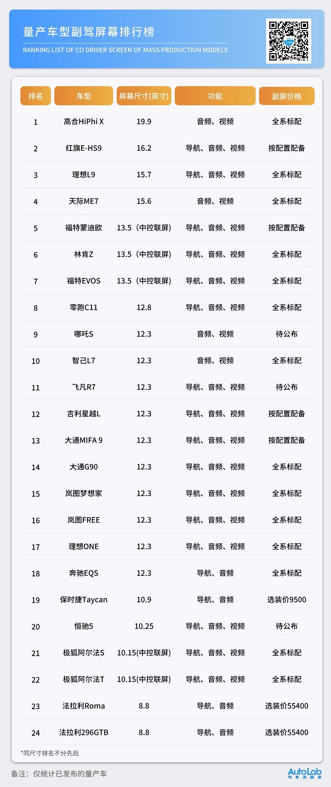 在经过榜单更新之后,像理想L9、飞凡R7、哪吒S、大通MIFA 9、恒驰5等近期发布的新车都进入了副驾屏幕排行榜中。