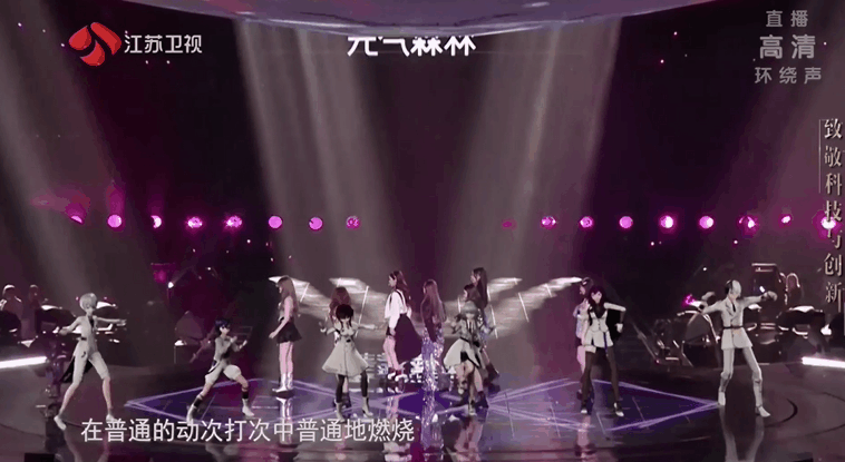 当然,除了经典之音重现之外,还有来自二次元的破壁之舞。在今年江苏卫视跨年演唱会上硬糖少女303与Vsinger家族洛天依、乐正绫、言和、乐正龙牙、徵羽摩柯、墨清弦联袂登场,硬糖少女303演唱《了不起的女孩》,Vsinger唱跳《卡路里》,然后两支队伍共同演绎《普通DISCO》,在这个过程中,两支队伍先是分别唱跳,然后合体齐舞,甚至还有团队之间的BATTLE。