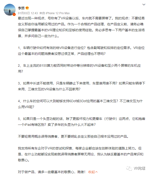 陀螺科技1月4日讯,在蔚来汽车宣布联合NOLO打造车内VR头显后,在汽车行业和VR行业引发热议。理想汽车CEO在社交平台上对此表示,最近出现一种观点,号称有了VR设备以后,车内就不需要屏幕了。我的观点:不要轻易定义那些你连用都没用过的产品。作为一个合格的产品经理,在产品定义前,请务必确保自己掌握最基本的VR理论知识和足够的使用经验。务必多思考一下用户基本的生活场景,并多问自己一些为什么。