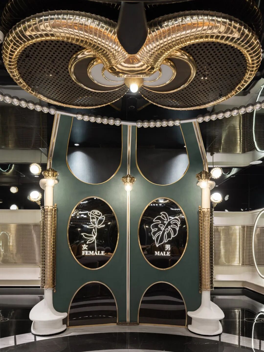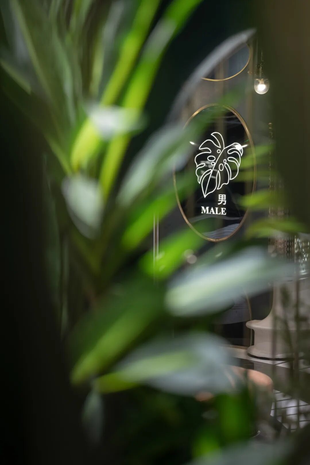 △男女卫生间,趣味性地以“玫瑰”与“棕榈叶”作为区分表达