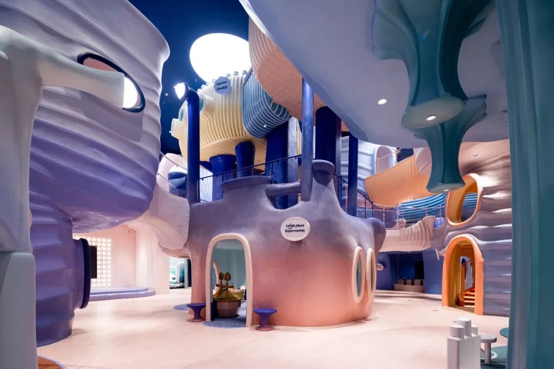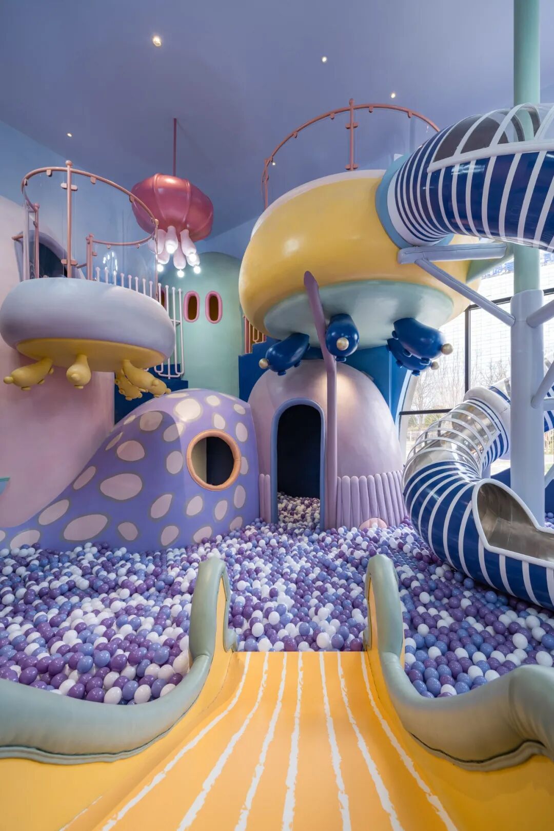 应原创亲子文化娱乐品牌“优我宝”的委托,唯想国际将一座老旧厂房焕新改造为大型儿童艺术美学乐园。厂房优越的室内层高与新品牌的初生引发了设计师的想象,一片无限闪动的蓝色海洋从潜意识里浮现。