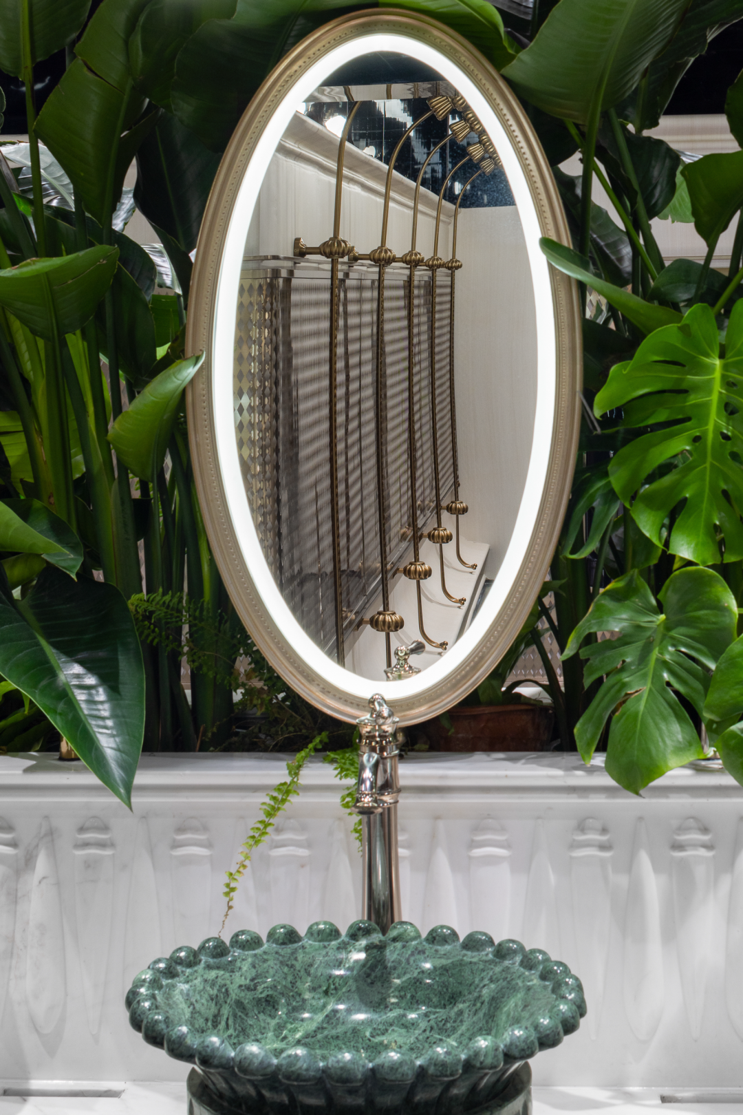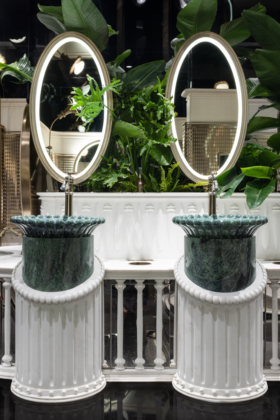 盥洗台灵感来源于花园中的喷泉,巧妙利用高差将功能性妥当融入,绿植与绿色大理石洗手台盆既呼应了空间故事线,也使其成为室内唯一色彩鲜明的视觉焦点。