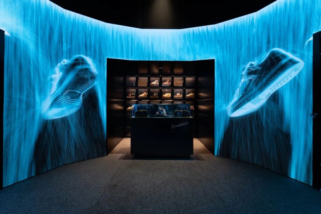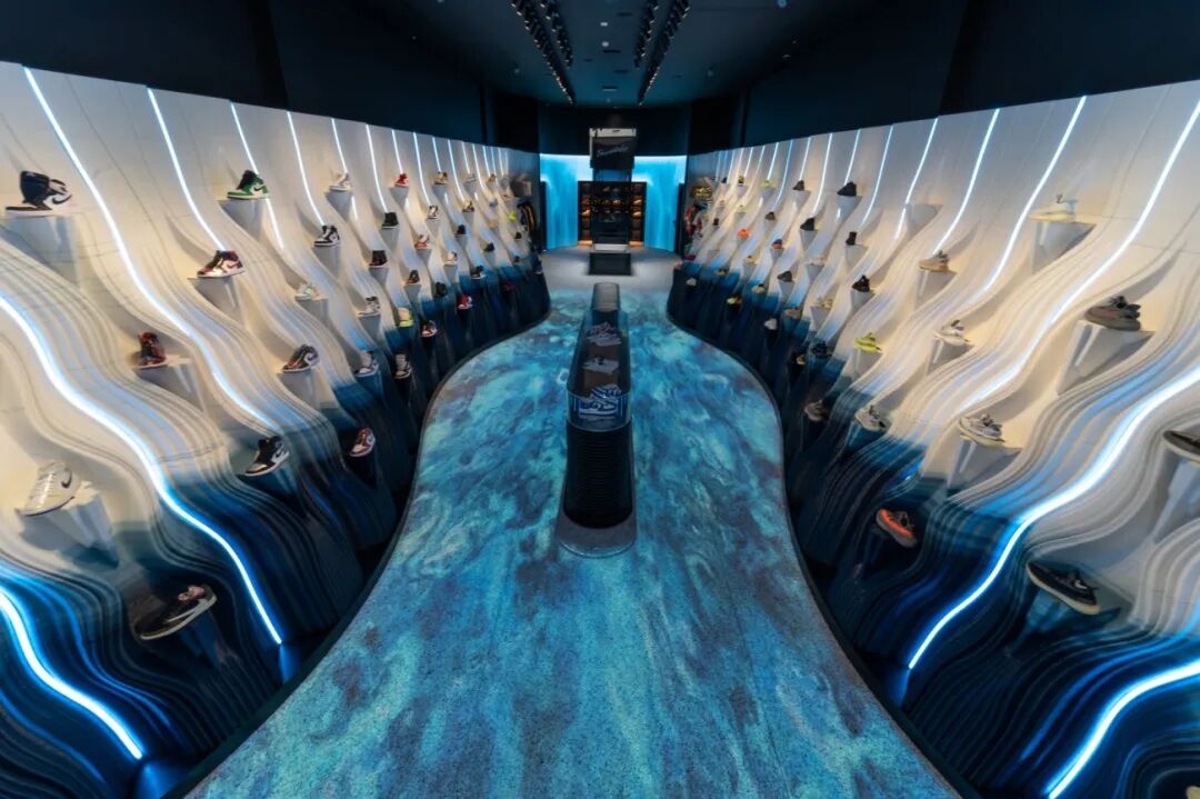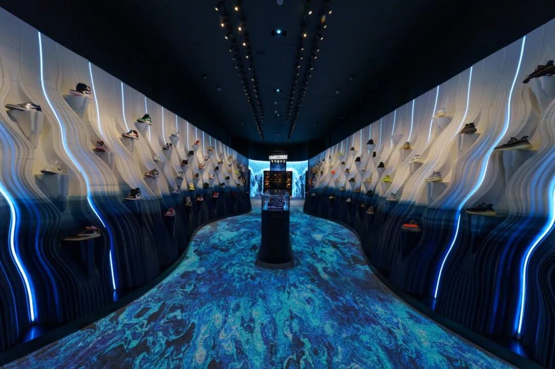 陈列在商店里的产品通过水流形成的形态展示出来。此次设计中有17米长、3.5米高的展示墙位于商店两侧,展示墙模拟了水从运动鞋中倾泻跌落后被及时冻结的效果。墙壁上满3D打印La Máquina,使用的是PLA和PURE科技材料(一种天然矿物化合物)。