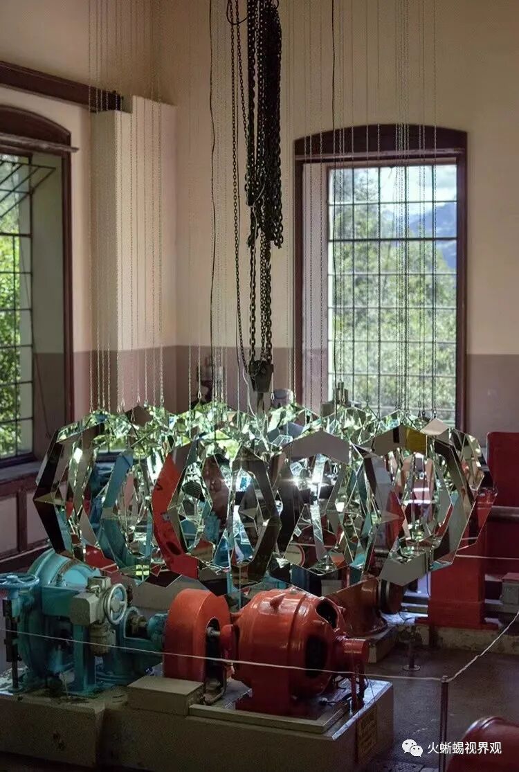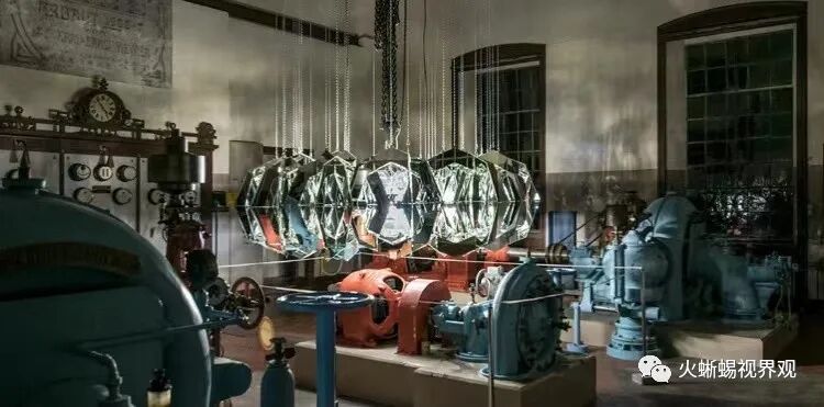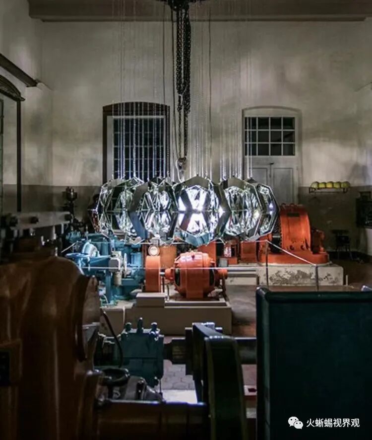 艺术家Thomas Medicus(托马斯·梅迪克斯以水力涡轮机的形式,在奥地利因斯布鲁克一个退役的水力发电厂悬挂了场地特定的玻璃装置《EBBE》。该装置展示了从天花板上悬挂的复杂的涡轮机形状的镜子碎片,这些闪闪发光的形式映射出了周围的环境,并与停滞的自然和工业机械的坚固物质性形成对比。