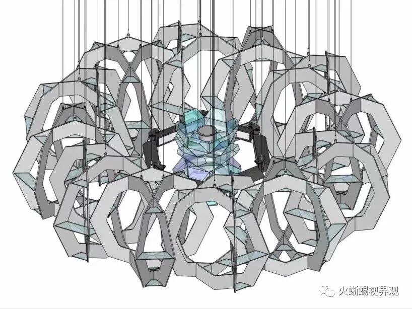 “这个彩色玻璃雕塑的灵感主要来自一个巨大的漂浮荧光变形虫的想法,通过结合和抽象其他生命形式的视觉上的显著特征,艺术作品指出了生命作为一种难以把握的现象的魅力。由于雕塑闪闪发光,它会在很远的地方引起人们的好奇,只有靠近雕塑才能发现它细致的绘画图案。”