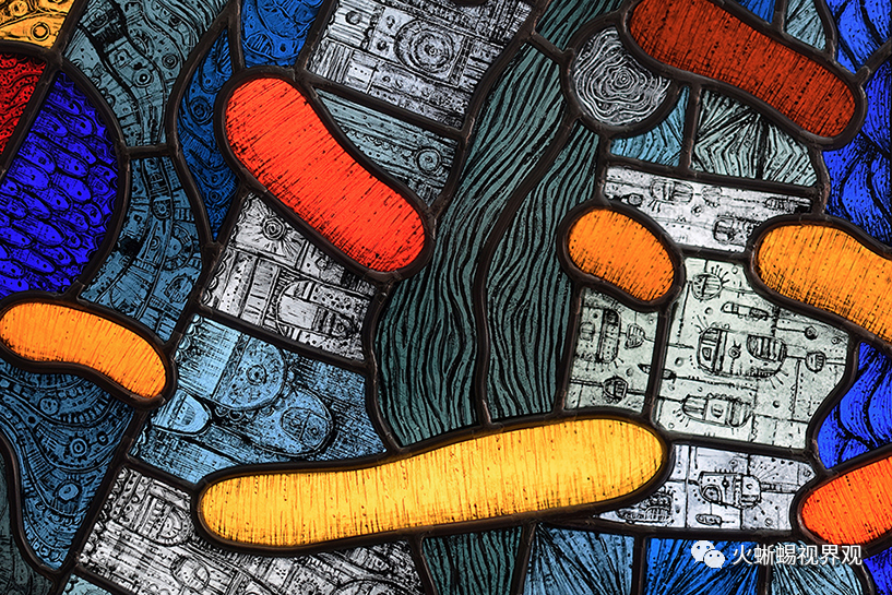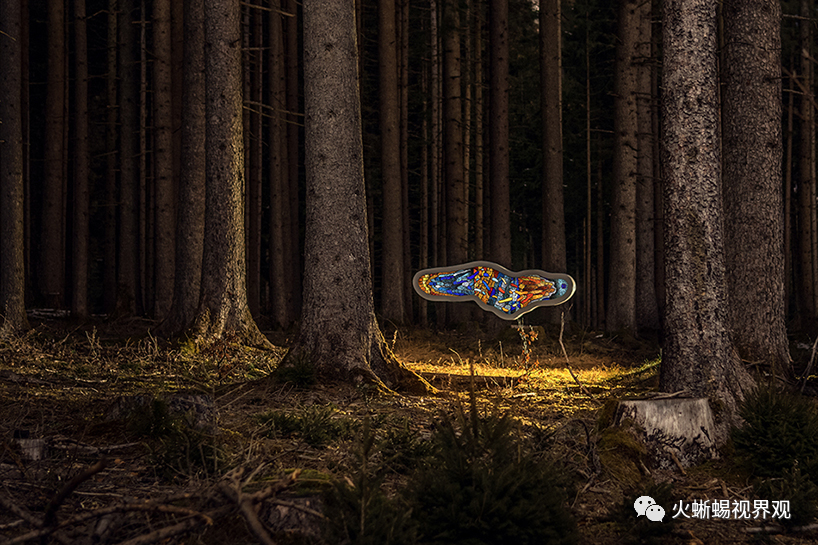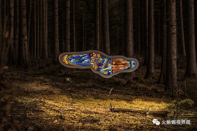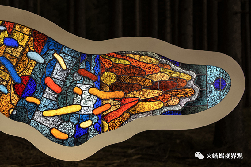 从远处看,这个不对称的实体在森林环境中是一个棱镜和超凡脱俗的生物。仔细观察,可以看到在玻璃片上刻有复杂的符号和图案:细致的装饰——从康定斯基式的图案到鱼状的鳞片——在彩色的框架中被抽象和绘制,为项目增添了独特的工艺感和个性。