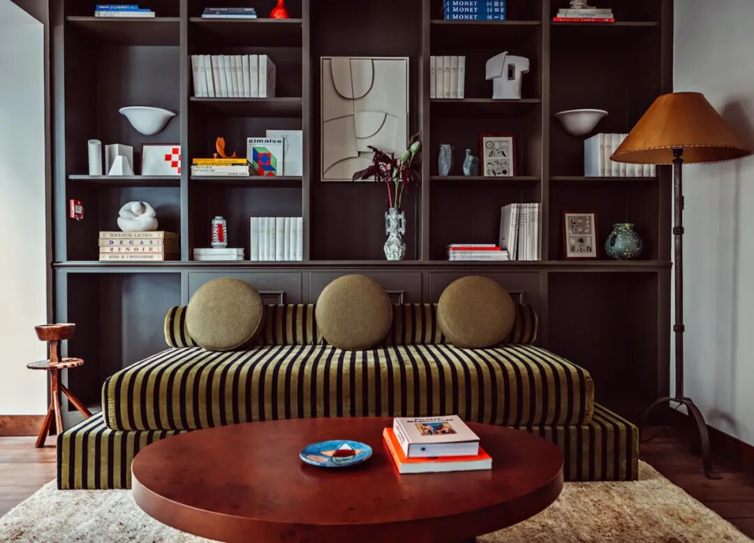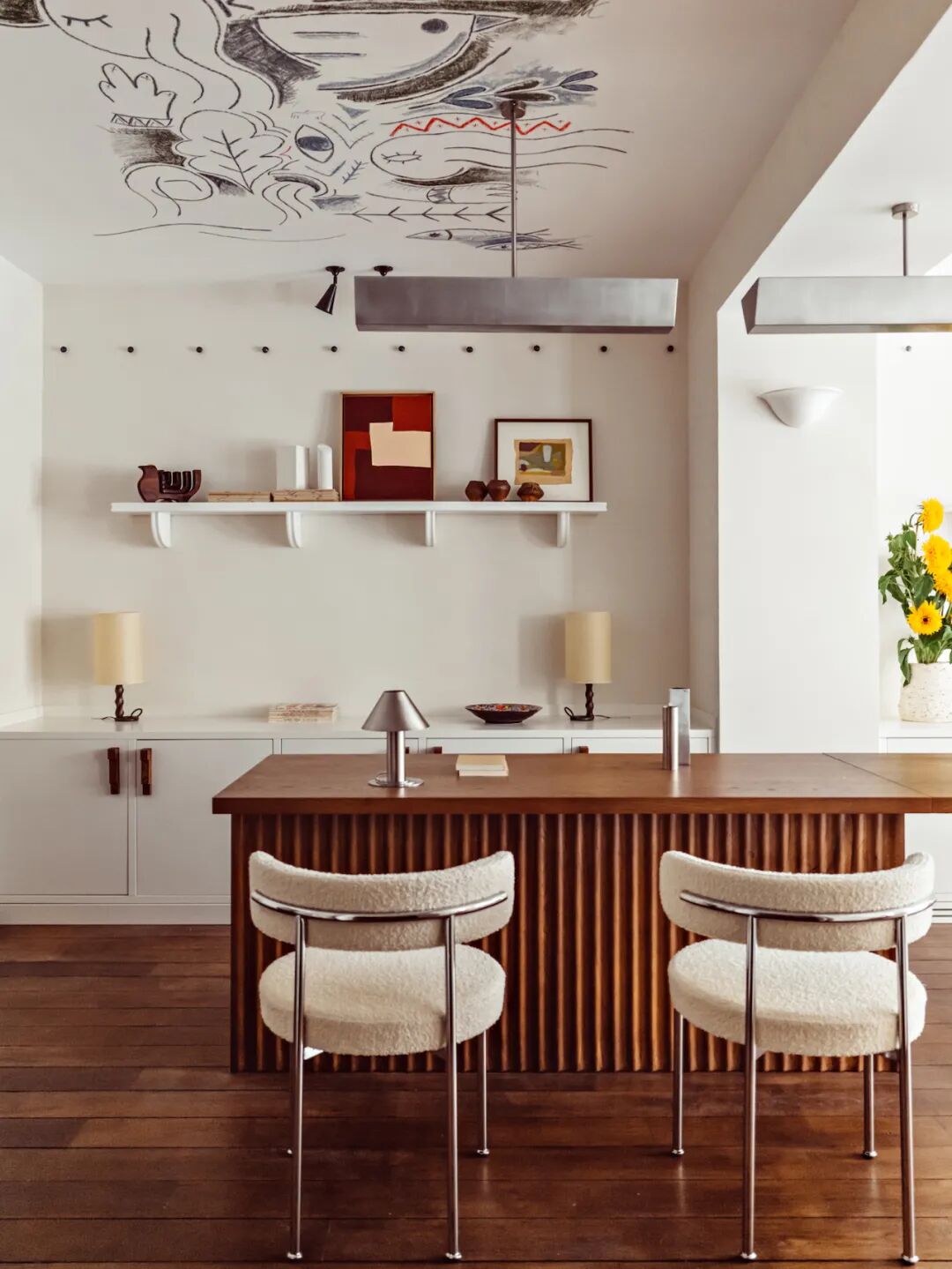 大堂看起来更像是私人办公室或书房,而不是接待处,内置储物柜,开放式搁板和坚固的橡木书桌。插画家弗兰克·勒布雷(Franck Lebraly)的壁画让人想起毕加索的“草地上的午餐”。