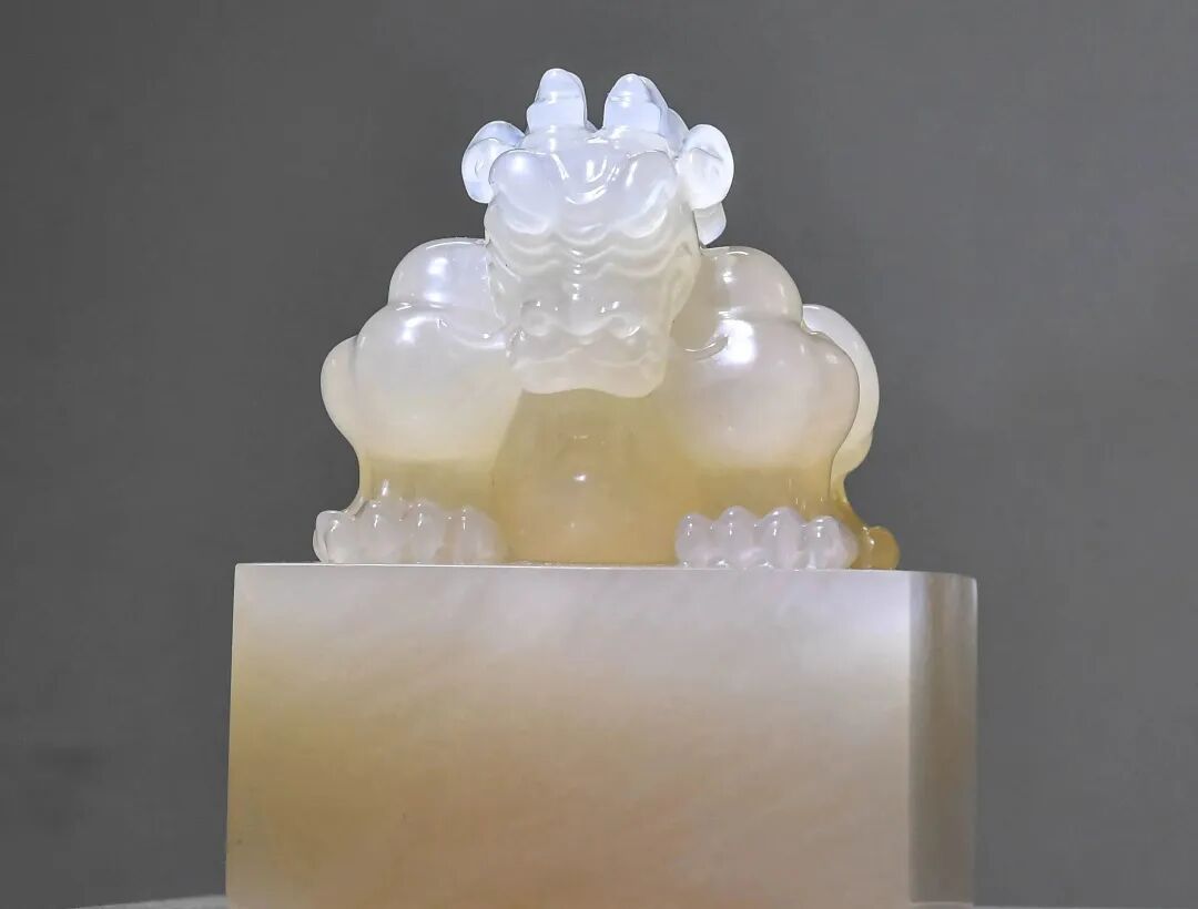 石头有多少生命,灵感就有多少来源。收获美石后,这位藏家就开始着手为爱石寻找雕刻师,他告诉我们:“此石最难得的是通体无瑕,纯白莹润。拍回石头之后,心中唯一雕刻人选就是郭祥忍老师,于是几次登门拜访,请他雕刻兽钮。成作也令人十分惊喜!兽钮威严霸气,势不可挡,玺印体量巨大,大气磅礴。”