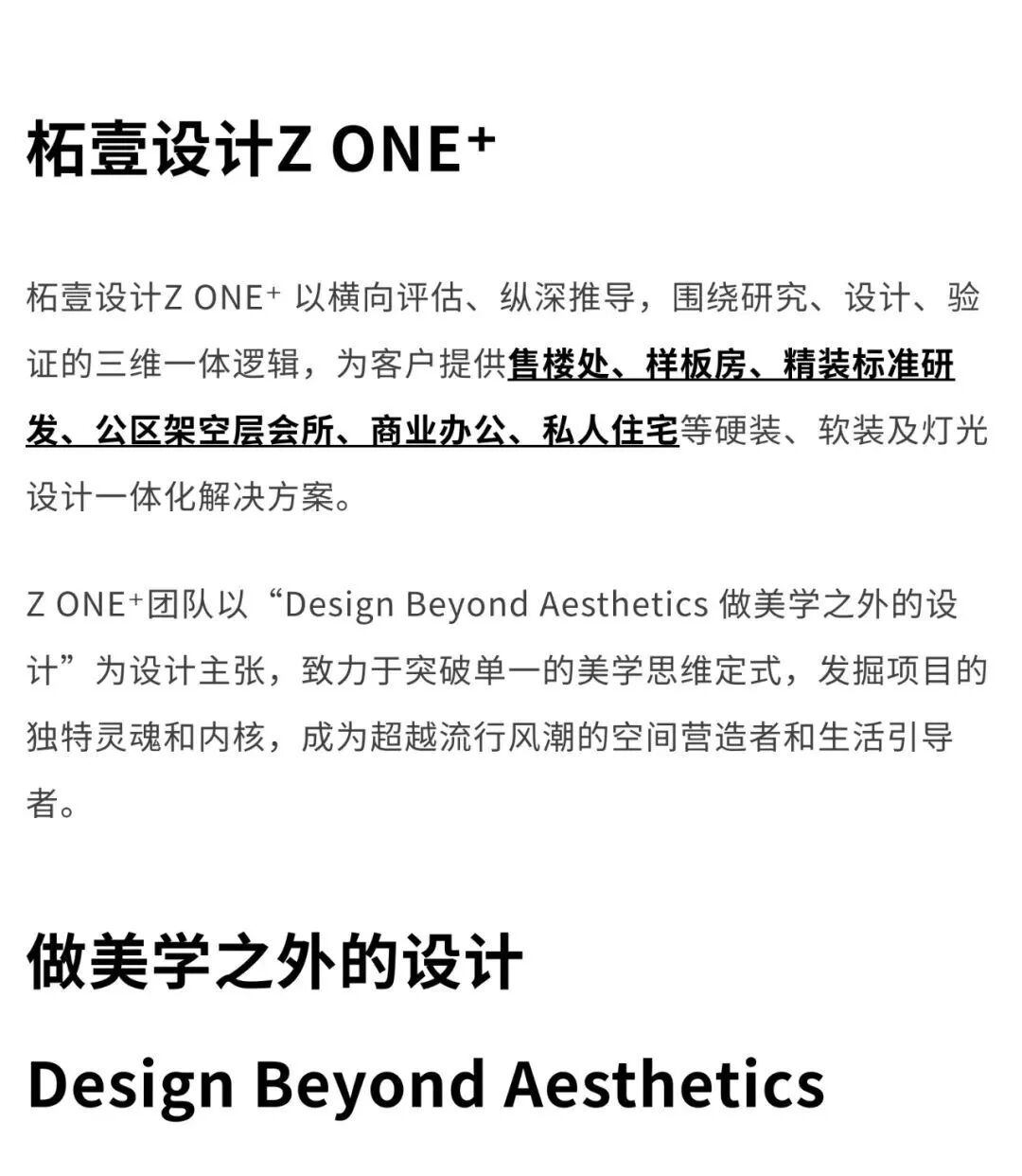 柘壹设计Z ONE⁺创立于深圳,根植于地产、商业、办公、住宅等领域,坚持以用户为中心的产品视角,对产品背后真实的生活需求追问到底,为客户提供售楼处、样板房、精装标准研发、公区架空层会所、商业办公、私人住宅等硬装、软装及灯光设计一体化解决方案。