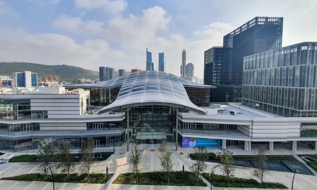 本综合体项目位于墨西哥蒙特雷的圣佩德罗,通过由中心凉棚与景观室内广场构筑的零售空间一系列设计手段,将户外空间引入室内。商业区域环绕着大型的中央花园展开,中央花园的半透明曲面结构穹顶彰显着空间个性。