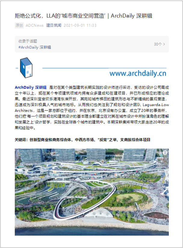全球权威建筑媒体Archdaily,以“拒绝公式化,LLA的‘城市商业空间营造’”为名,独家对话LLA规划和设计团队,分享20年的设计成果和经验,全景式呈现事务所在全球各个城市的建筑实践。采访内容以图文形式完整收录于“ArchDaily深耕辑”,并同步发布在Archdaily官网和公众号。