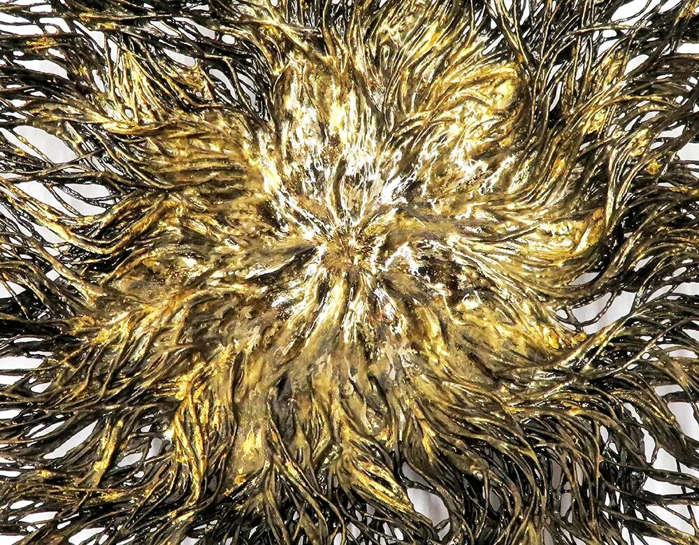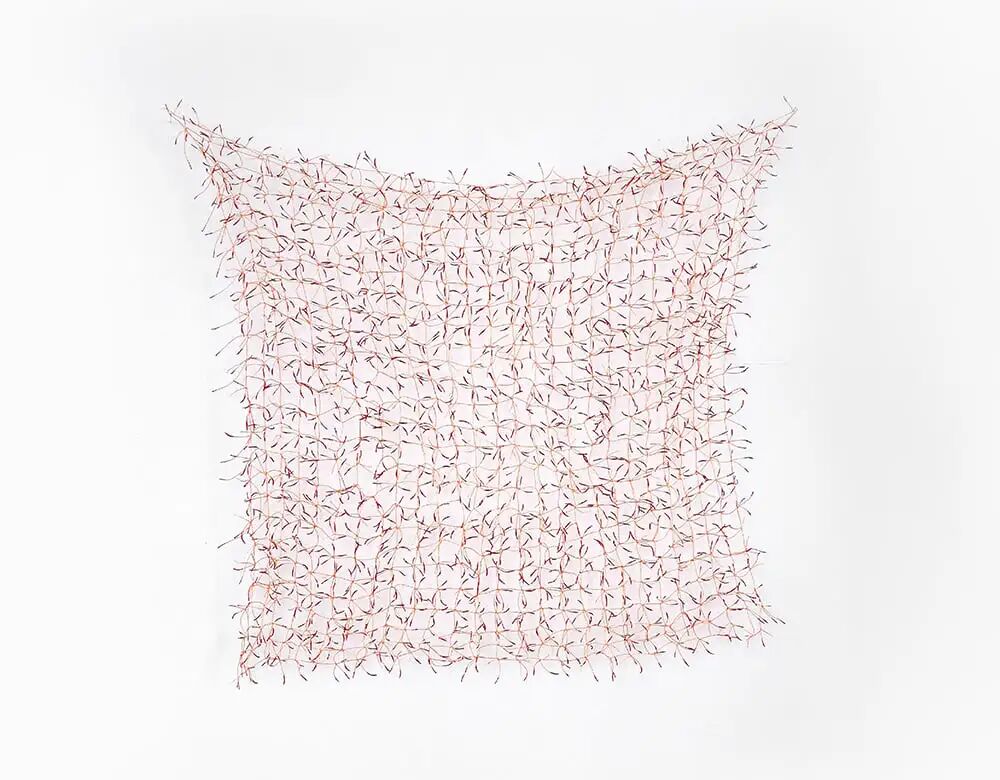 通过将薄纸条打结,作者创作出这幅充满冥思性的作品。作者使用了在日本京都驻地期间学习的技术,构建出一面相互连接的网络,每处纸结都代表着个人生命中的一个时刻。每个结都被染成了红色,以表示记忆的意义,连接它们的细长纸线如同花蕊,而其贯通的记忆就如同植物的花粉,象征了生命与成长。