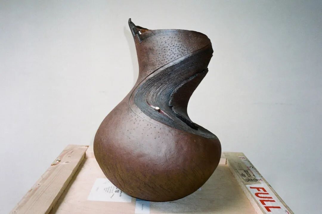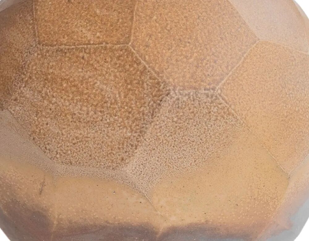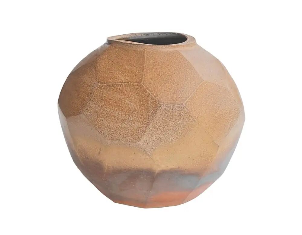 这一器物彰显了创作者对粘土的深刻理解,以及如何操纵它来改变其特性。借鉴韩国古代传统技艺,器物在陶轮上被塑造,起初光滑的外表在一系列精确的雕刻和切割后,被巧妙地塑造成一个切面的几何表面。在烧木柴的窑炉中烧制,使其表面产生了不同的纹理,增强了粘土的自然色彩,成为器物斜面的点睛之笔。