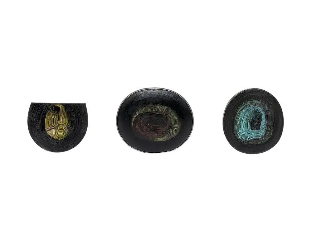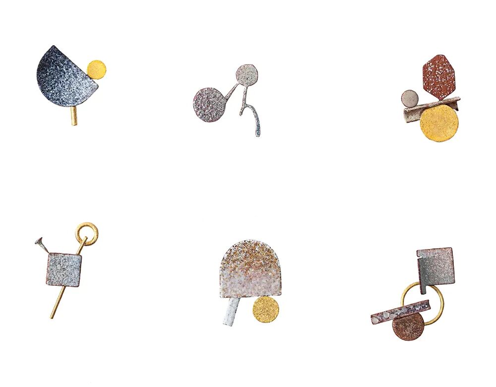 在这套三枚一组的珠宝中,帆布被折边和卷起,创造出一套分层复杂的可穿戴胸针。卷起的画布被固定在一张薄金属板上,其边缘被涂上漆以创造光滑的边缘。中间的画布裸露在外,而后被涂上薄漆,如同沉积岩一般标志着时间的流逝。