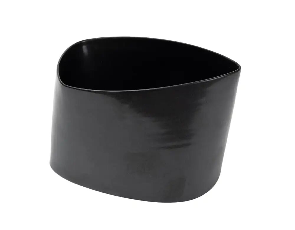 这一手工铸造的利摩日瓷器是对空间和运动形式的美丽研究。瓷器的柔韧性被大胆地用技巧和精度处理,创造出微微扭曲的姿态,并呈现相对的三角几何形状,并施以丰富的缎面黑色釉面,成品带有一种和谐、优雅和惊喜的感觉。