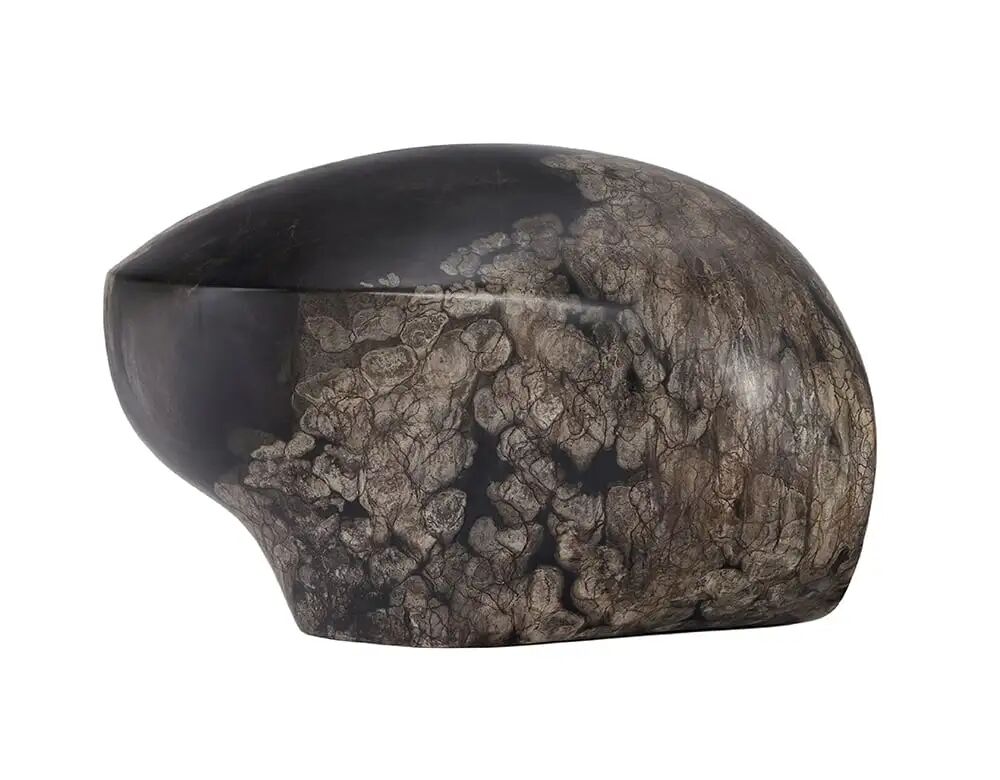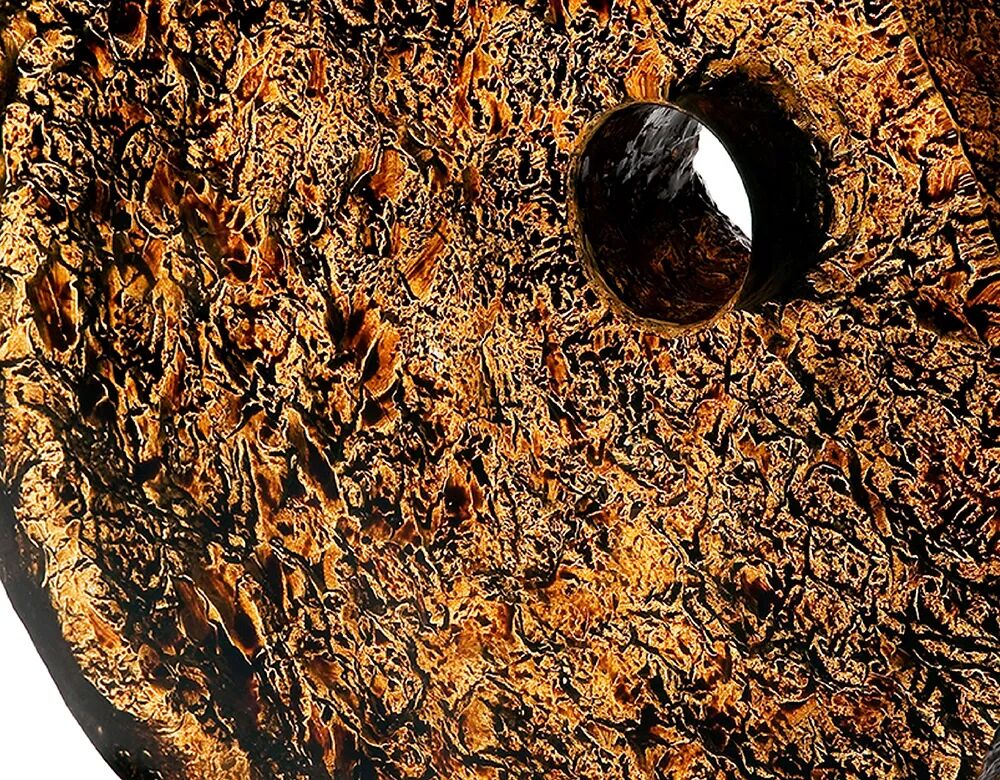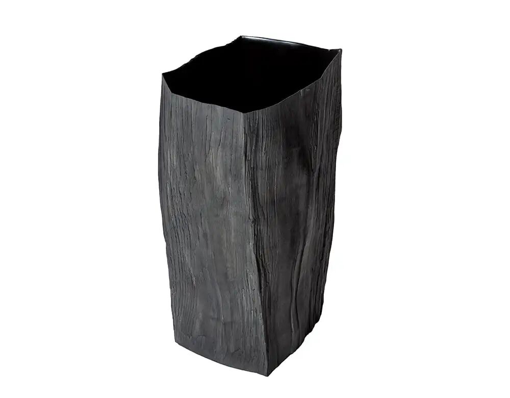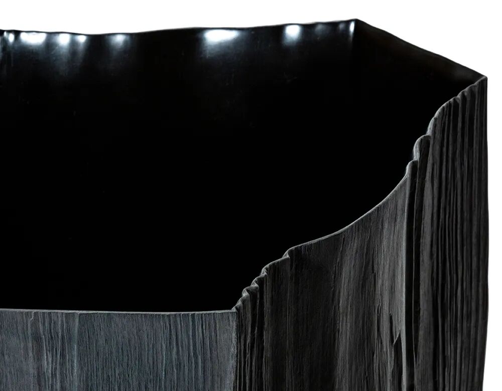 这一独特容器采用日本古漆树的残余树桩制作,结合了日本古老传统工艺和革新自创技艺。树干被挖空,安装了一面底座。容器的内部表面被精细抛光,而外部则保留了树皮的原始特征和痕迹,这是该树在其一生中经受严寒的证据。在夏秋之交的短暂时间里手工采摘的大漆被施于器物表面,完成了这一作品。