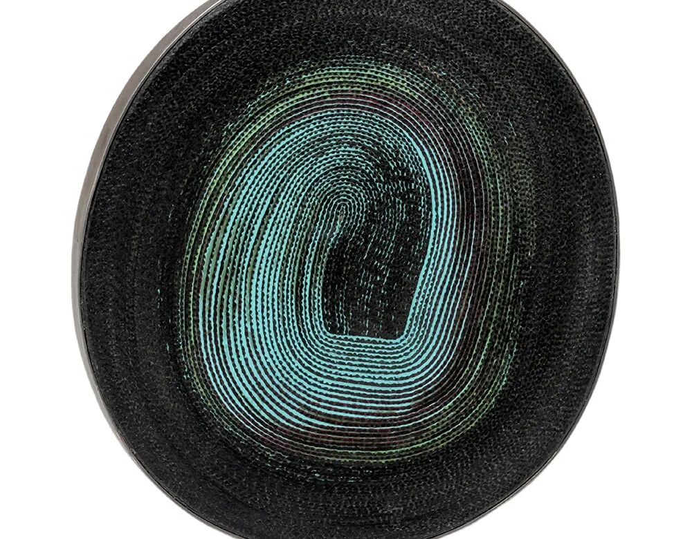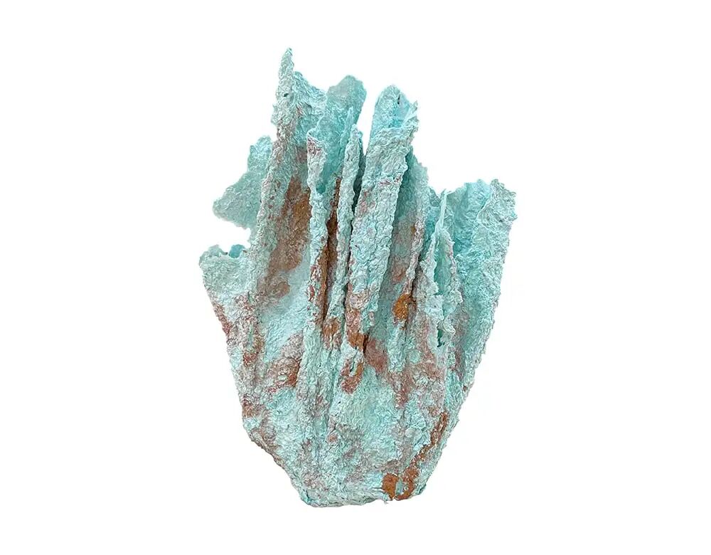 这件聚拢一处的华美绿松石容器扩展了篮形结构的极限,并借鉴了美国本土的传统。来自亚利桑那州索诺兰沙漠的现成材料,包括熊草、丝兰、野花、杂酚油、铜、火山岩和龙舌兰被混合成纸浆,并垂挂在石料上,创造出富有表现力的形状,它传达着来自诞生地的世代教诲和记忆。