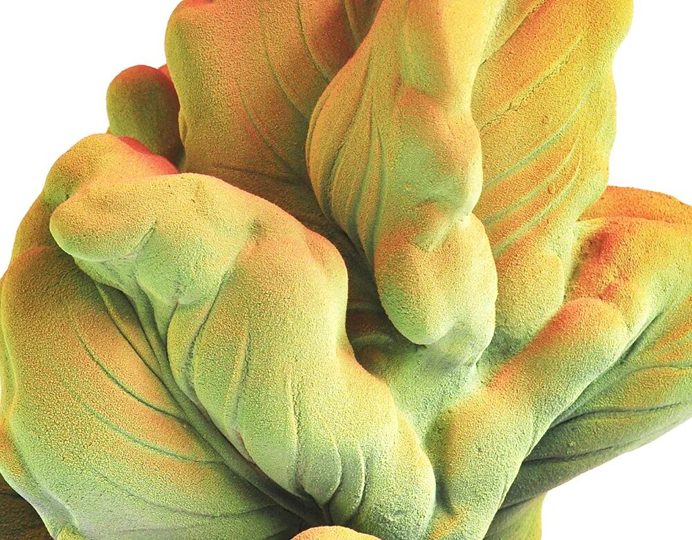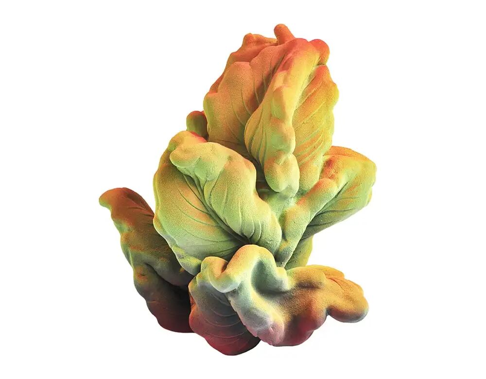 石膏的板块元素被冲压入模,小心翼翼地扭转和调整形状,然后直观地连接在一起,创造出庞大伸展的有机造型,是对18世纪莴苣器皿的俏皮致敬。随后,作品被喷上一层细密的釉,最终呈现由绿转红的渐变色,令人联想到植被与明亮的火焰。