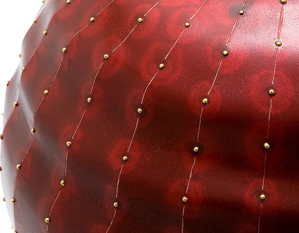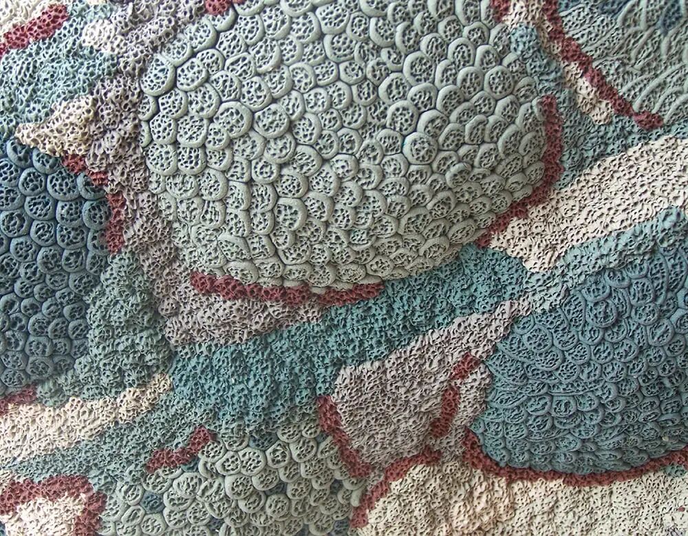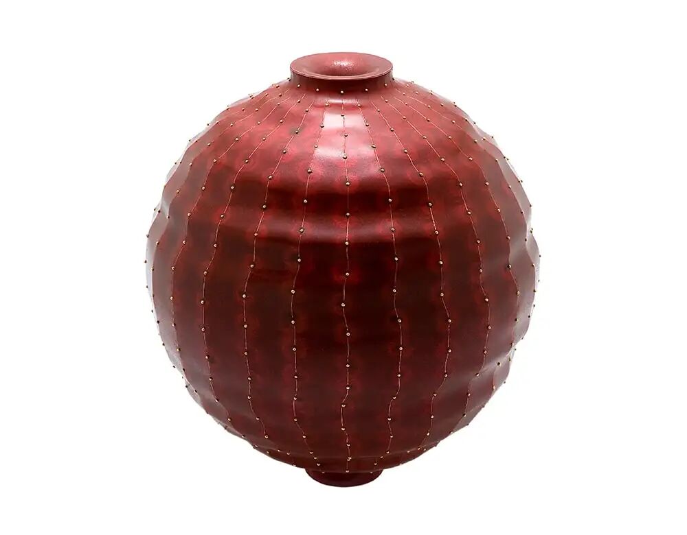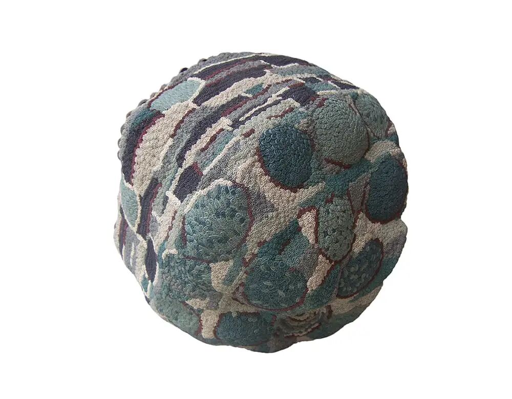 这一巨大的球状陶瓷作品初看如同一件纺织品,由不同的材料拼接而成,用白色和红色的滚边划分区域。在它的中心是用氧化钴和绿松石染色的石器。在历时五个多月的制作过程中,微小的粘土球被精心地用手滚压和压扁,然后用针刺出一个有纹理的表面,形成了类似天鹅绒的华美触感。