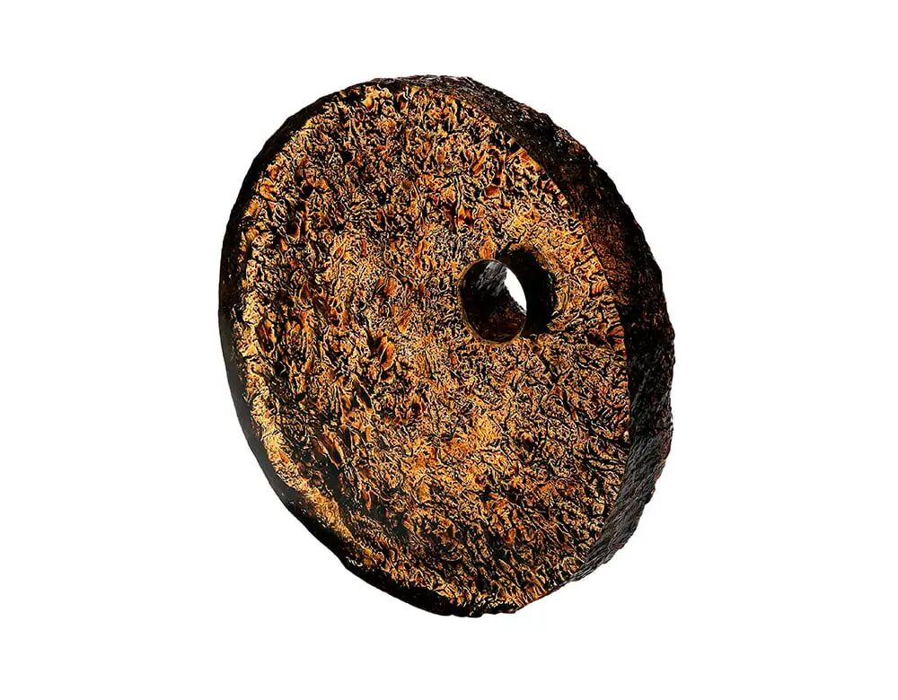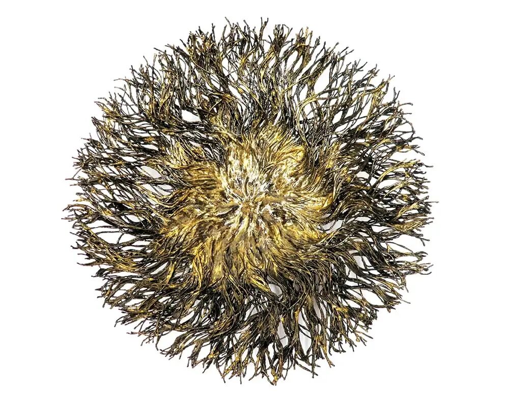 这项高度实验性的工作以意想不到的方式结合了材料。受陶瓷传统的启发,这里的玻璃被用作粘土。圆盘状的形状,有一个小的圆形切口,是在玻璃中铸造的,然后使用传统的奥特奇尔漆技术完成,用金叶装饰,然后在窑中烧制。由此产生的工作是对质量和体积的研究,这只能通过利用玻璃的特性来实现。