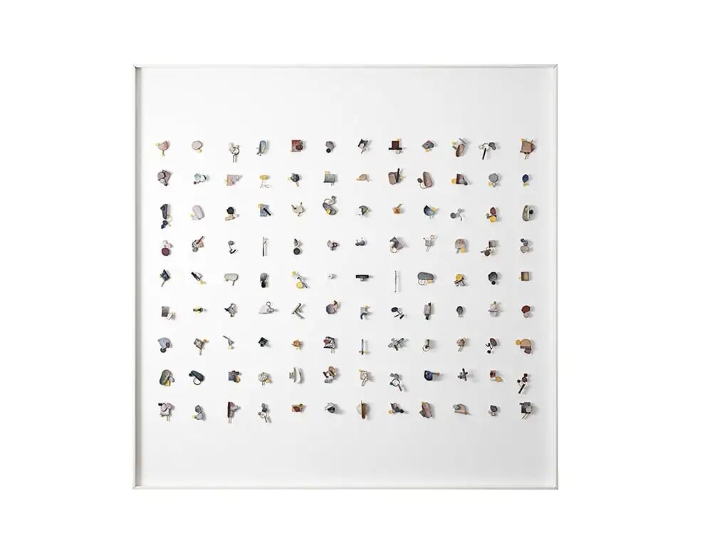 一张由108件小规模的可穿戴珠宝雕塑组成的台面,展示了各种珐琅工艺。这些作品的灵感来自于数字108在佛教中的意义,中国与日本的寺庙在除夕夜的午夜敲响108下钟声,作为一种净化仪式。这些珠宝作品是由作者过往项目的富余物料创造的,采取简单的抽象形式。与传统的上釉技术相比,经过乱序处理的熔化过程在表面上形成了对比清晰的区域。