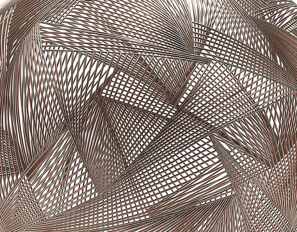 这一作品是对传统韩式瓷罐的现代诠释,结合了传统形式和现代美学,打造跨越功能和装饰之间界限的器物。由镍和铜线焊接而成,用银接驳成精致的截面,平面之间的重叠产生出复杂的阵列,并通过喷砂和手工打磨来创造出光滑的表面。