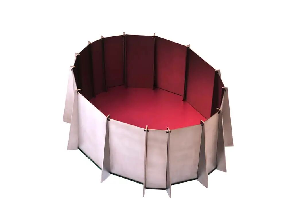 这一引人注目的大型金属容器将阳极氧化铝底板与近乎随机角度的钛制锯齿片相结合,支撑着薄薄的钛壁。内部被渲染成发光的粉红色,作品的棱角令容器壁的反射颜色发生变化——灵感来自澳大利亚大红岩在一天中不同时间点的颜色变化。