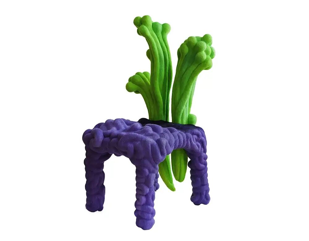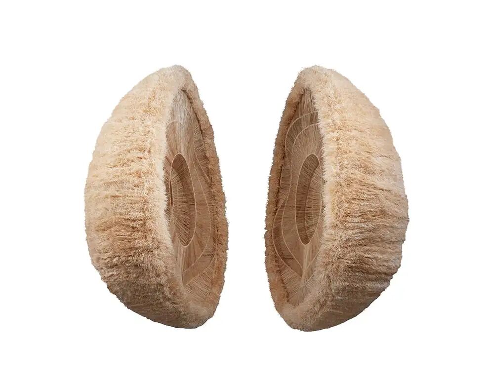 这把椅子将寻常的功能物件变作一种奇特的雕塑形式。原本代表家庭概念的室内空间被转化为自然世界一个缩影,参考了真菌、种子、珊瑚和生物病原体。以简单的雪松木骨架为开端,作者利用羊毛针毡作为雕塑工具,在几个月的时间里缓慢构筑出椅子的表面,一面坚硬的、令人惊异的密织结构。