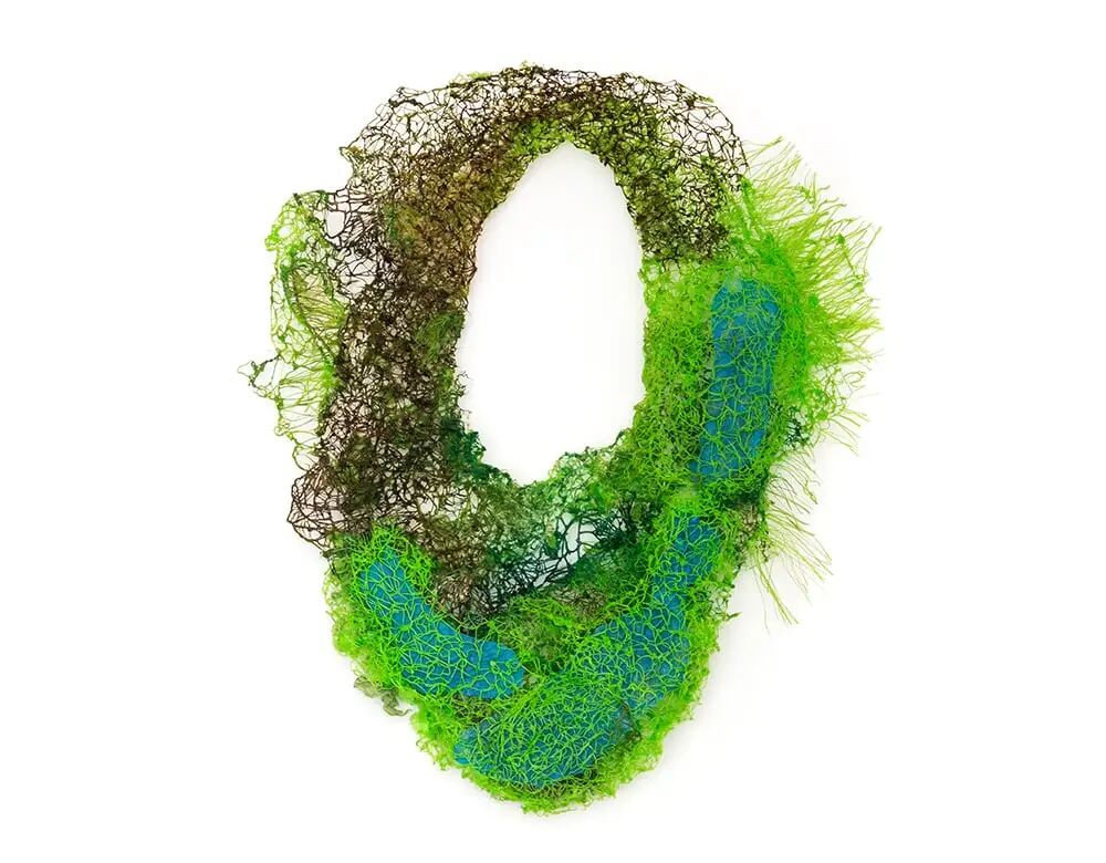 这件可穿戴配饰探讨了人类与自然界的关系,并强调了保护独特生态系统的极端重要性。该作品使用回收的聚乙烯袋创作,这些袋子被以不同的方式处理以创造各种纹理,是对拉丁美洲湿地的场景化表现。湿地在维护生物多样性和防洪方面发挥着重要作用,而这条项链记录了它们在人类影响下的存续挣扎。