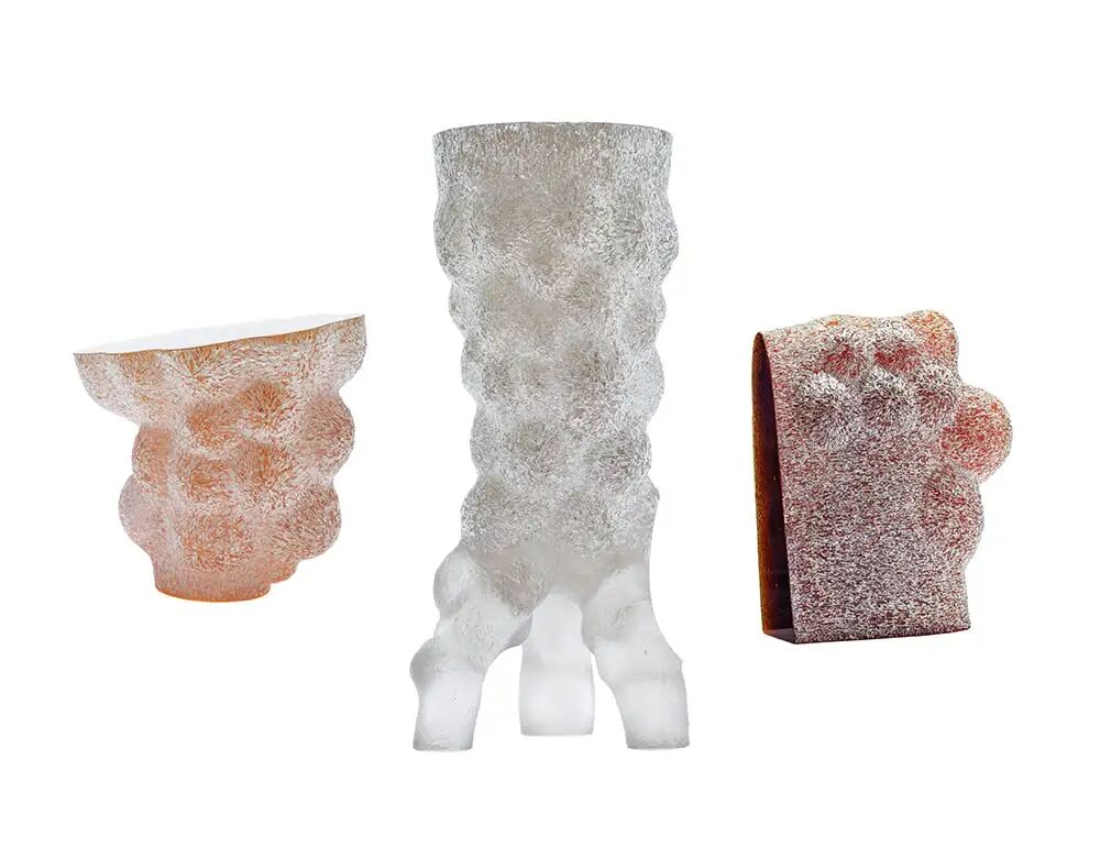 这种对光线的操纵,透过在作品表面创造对比强烈的哑光和光滑区域进一步呈现;通过使用几种不同的手工加工技术,包括研磨和抛光,创造出一种富有触感、结节状的纹理,展示了玻璃的艺术可能性。