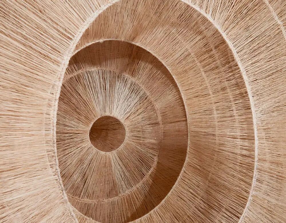 这个复杂的而具有表现力的雕塑作品使用苎麻纤维打造,受中国草布编织技术的启发。卵形的悬挂装置让人联想到关于世界诞生的中国神话:蛋生盘古,开天辟地。精细针织和编织的径向圈层创造出复杂的内部结构,这种对纤维的精湛运用与通过使苎麻纤维变形而产生的高密度外观形成了对比。