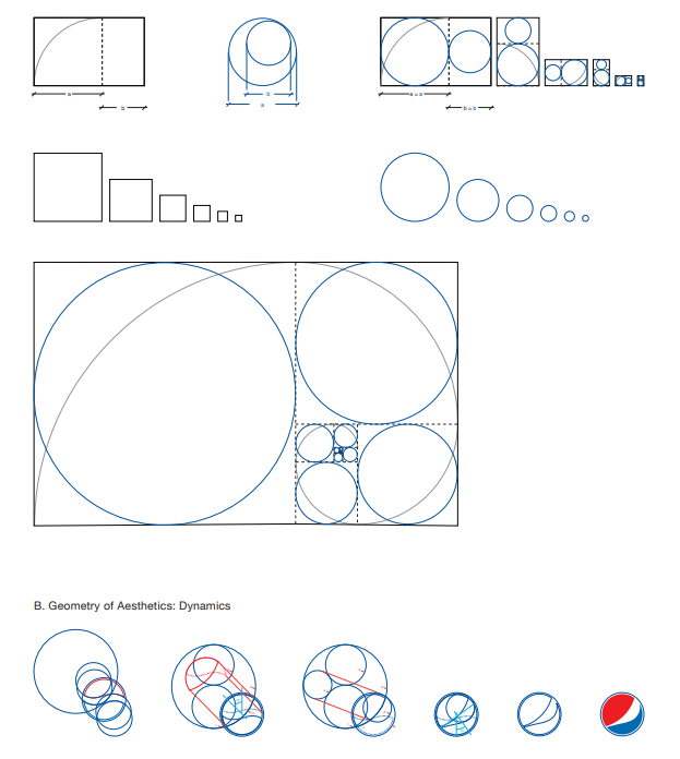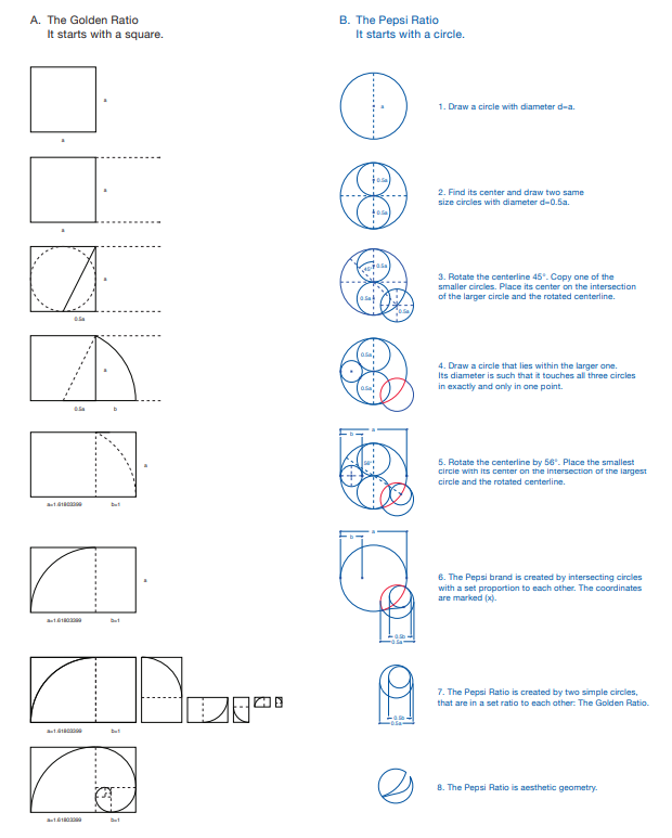 接下来对比分析,别人的黄金的分割线都是正方形开始的我们百事的比例是从圆开始的在尝试了各种设计重构后,标志的设计战略基于过去5000多年人类总结下来的设计智慧,遵循了黄金比例分割、几何学、modulor等众多数学知识和理论展开设计。