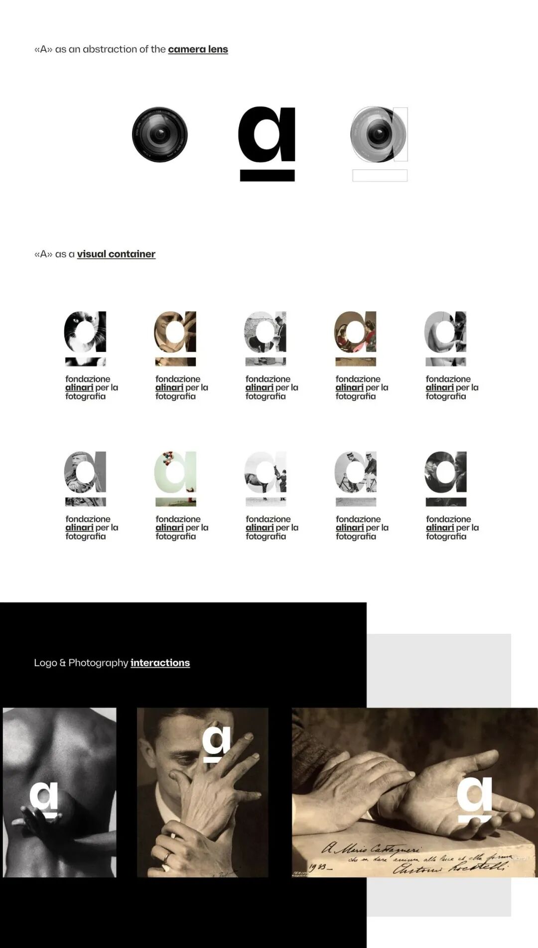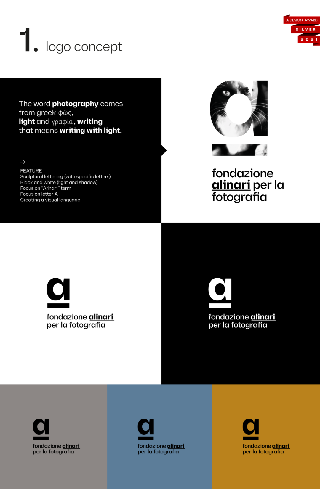 上图就是alinari(阿利纳里摄影基金会)的品牌logo,使用了品牌首字母a+下划线的组合。photography(摄影)一词源于希腊语φώς,也就是光的意思,而下划线则代表书写。整个logo的概念即用光写作,用摄影作品传递情感和力量。