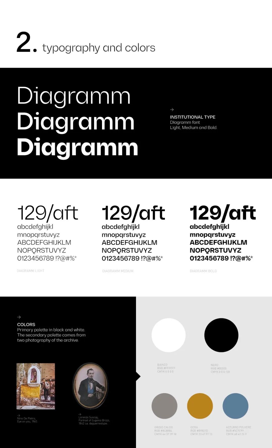 品牌字体使用了Diagramm,字型既现代又不失古典的美感;标准色的主色采用黑白两色,用以诠释经典,辅色则从基金会的两幅作品中汲取,传达质感和古典。