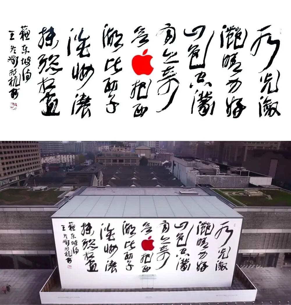 以苏东坡赞美西湖美景的诗作《饮湖上初晴后雨二首》为背景,融入了红色的苹果LOGO,书法与科技的混搭,中西结合形式让人眼前一亮!
