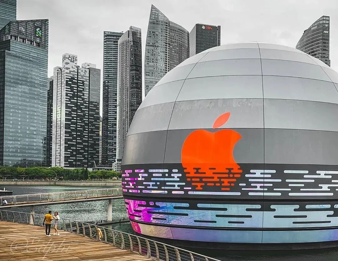 全球首个水上苹果专卖店,采用了水纹效果,LOGO好像是仿佛浮在水面上了!
