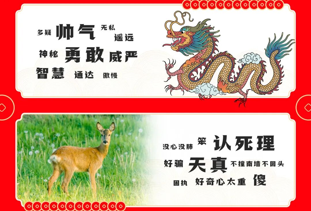 结合龙与狍子的差异画面,打破庄严与傻气的和谐感。