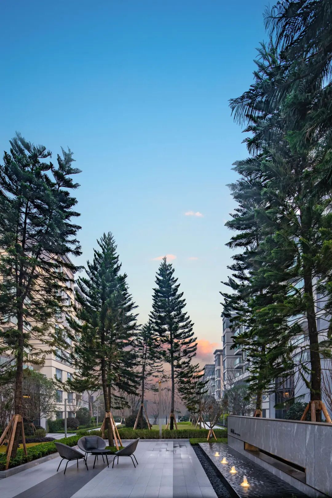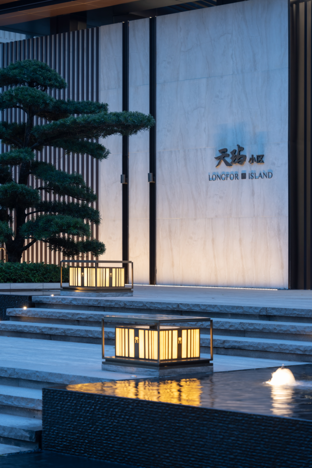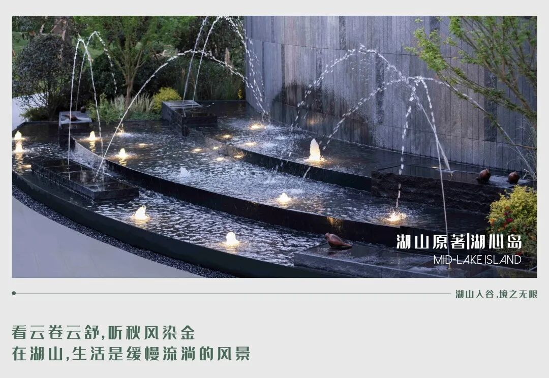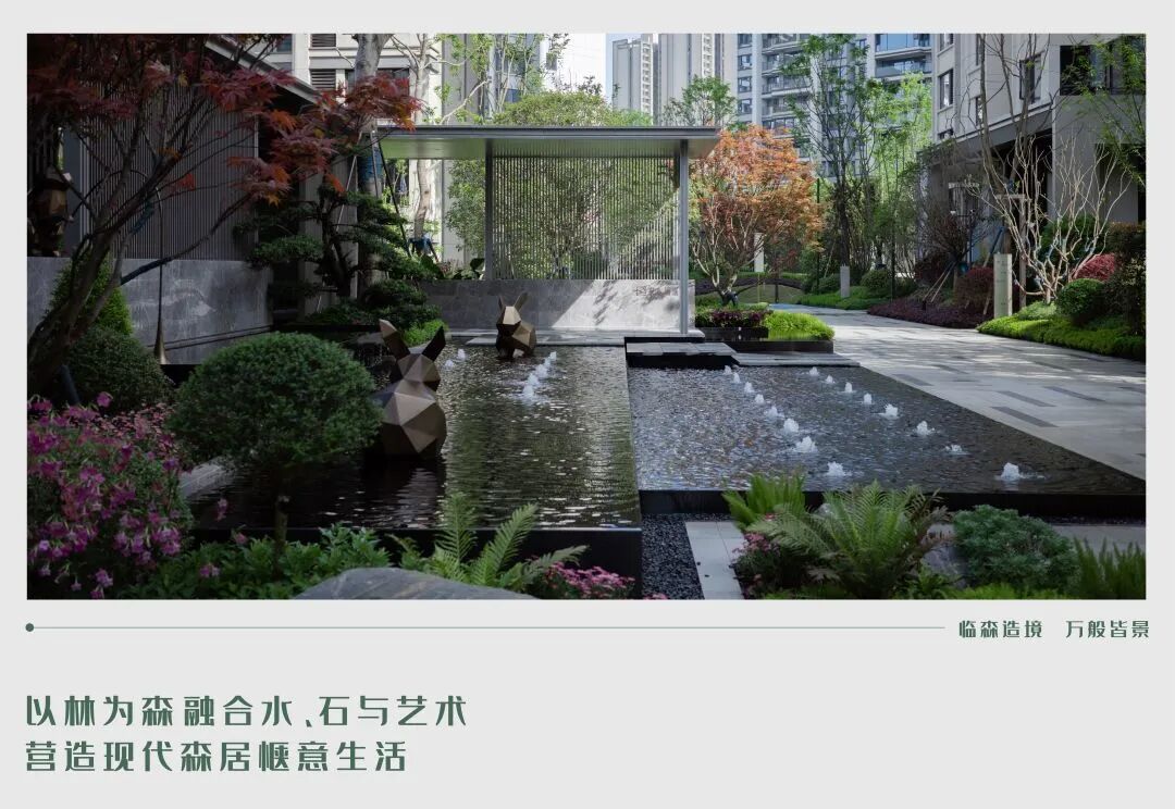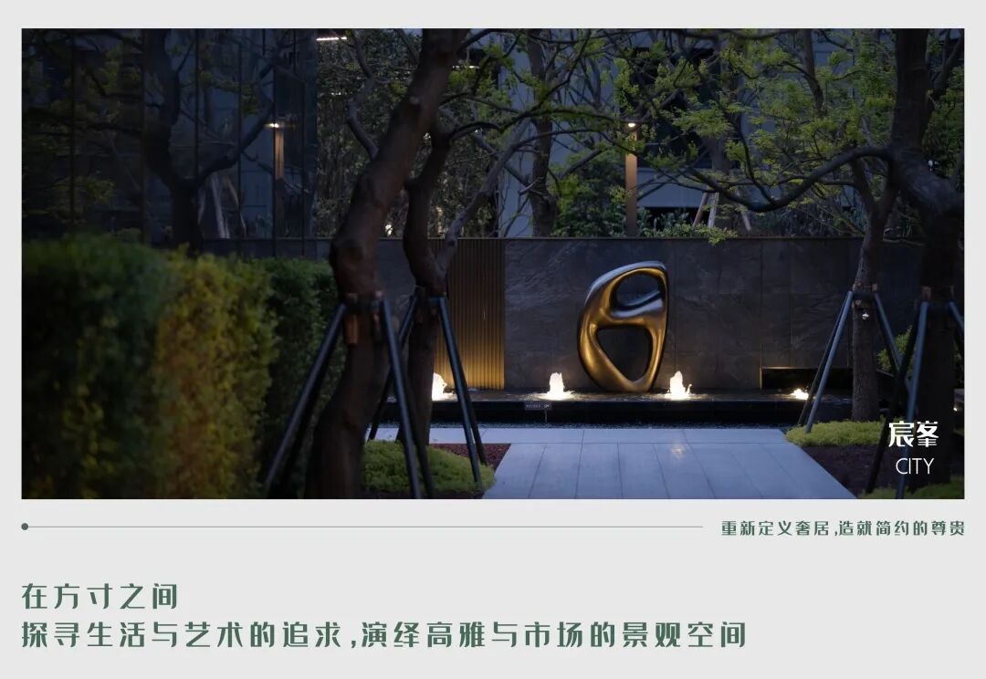 精致层叠处林荫花语,水光灯火交相呼应,指引着归家的方向。涌泉叠水静林雕塑,乌桕林下水景环绕,罗汉松迎客归家。
