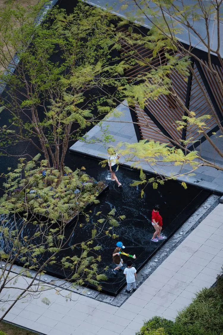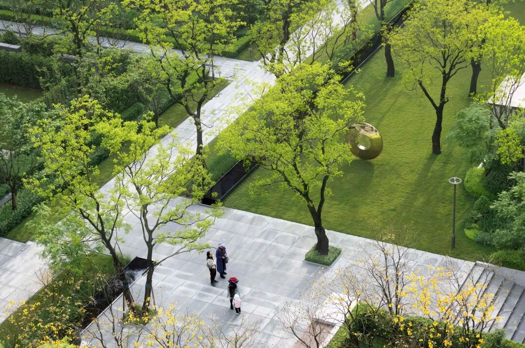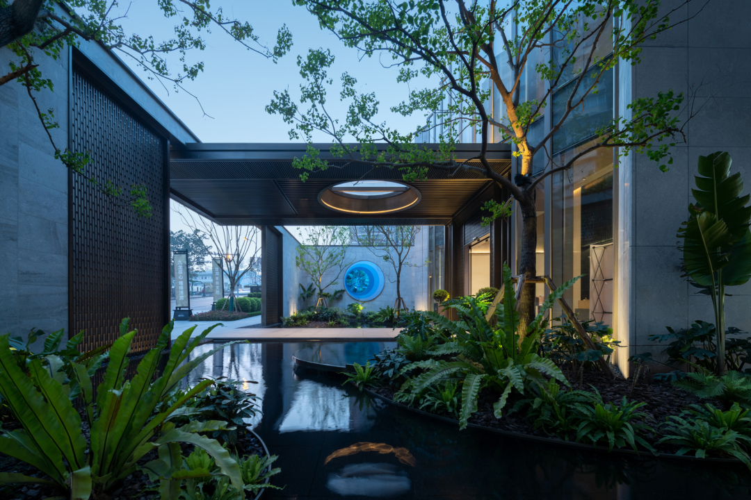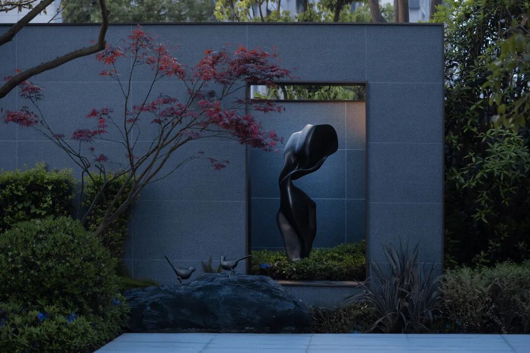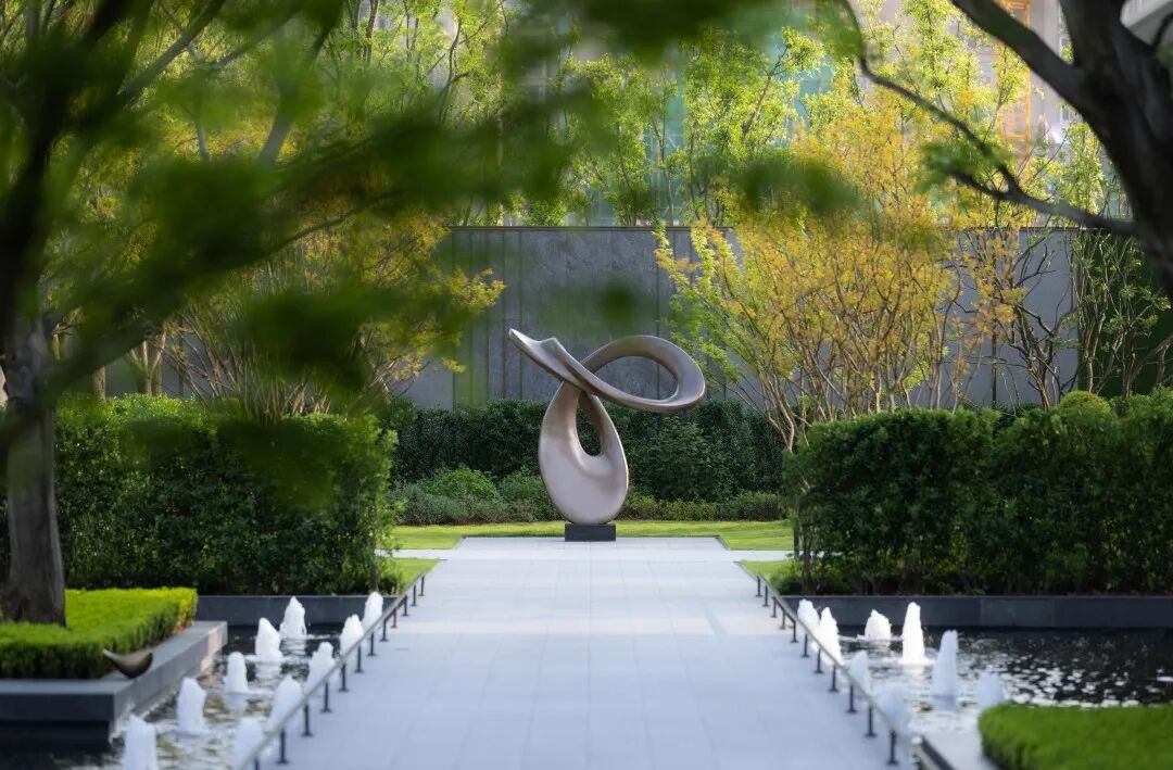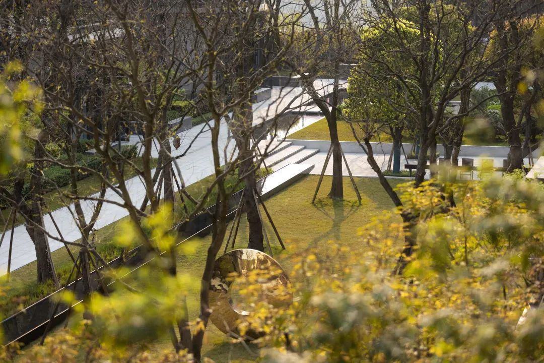 进入主入口,婀娜的乌桕光影、精致的雕塑、层层跌水、错落的花镜迎面而来,营造出无限的景深。临水而行,一处林下会客厅交错于斑驳树荫间,可赏可憩。