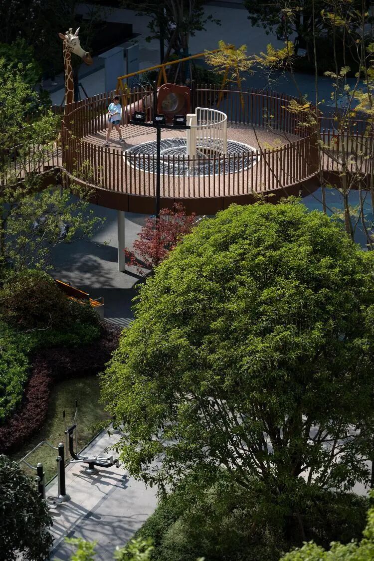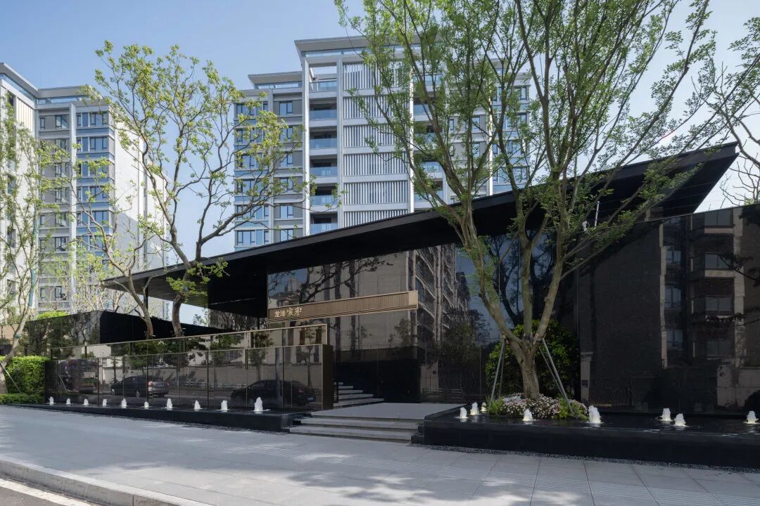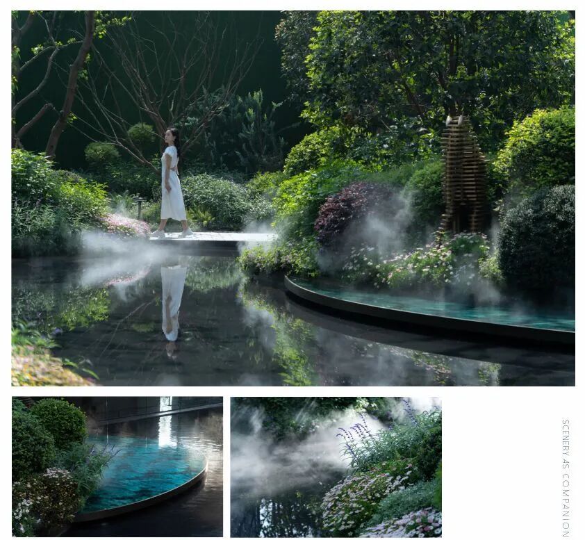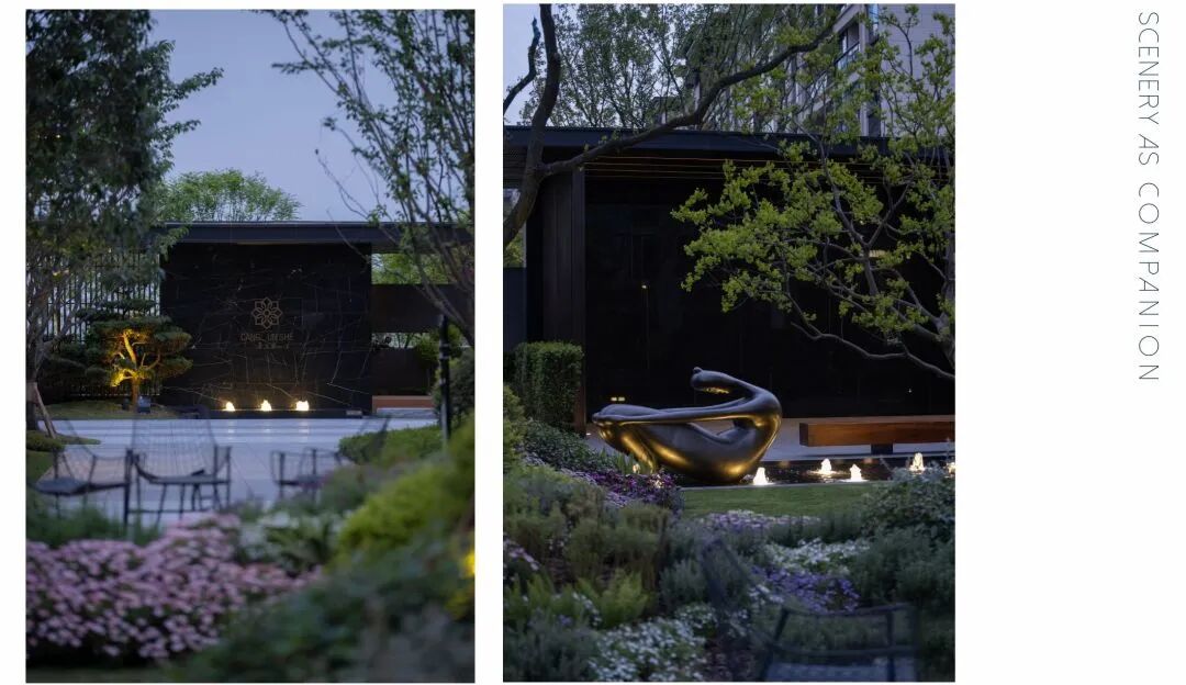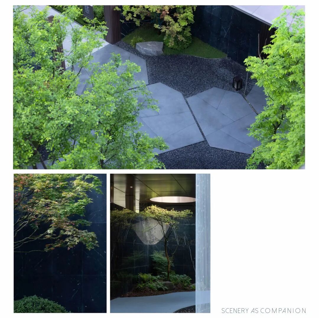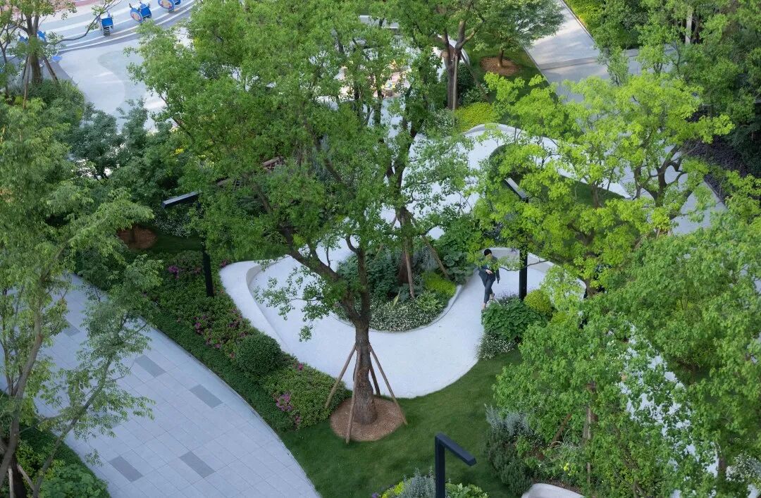 进入主入口,婀娜的乌桕光影、精致的雕塑、层层跌水、错落的花镜迎面而来,营造出无限的景深。临水而行,一处林下会客厅交错于斑驳树荫间,可赏可憩。