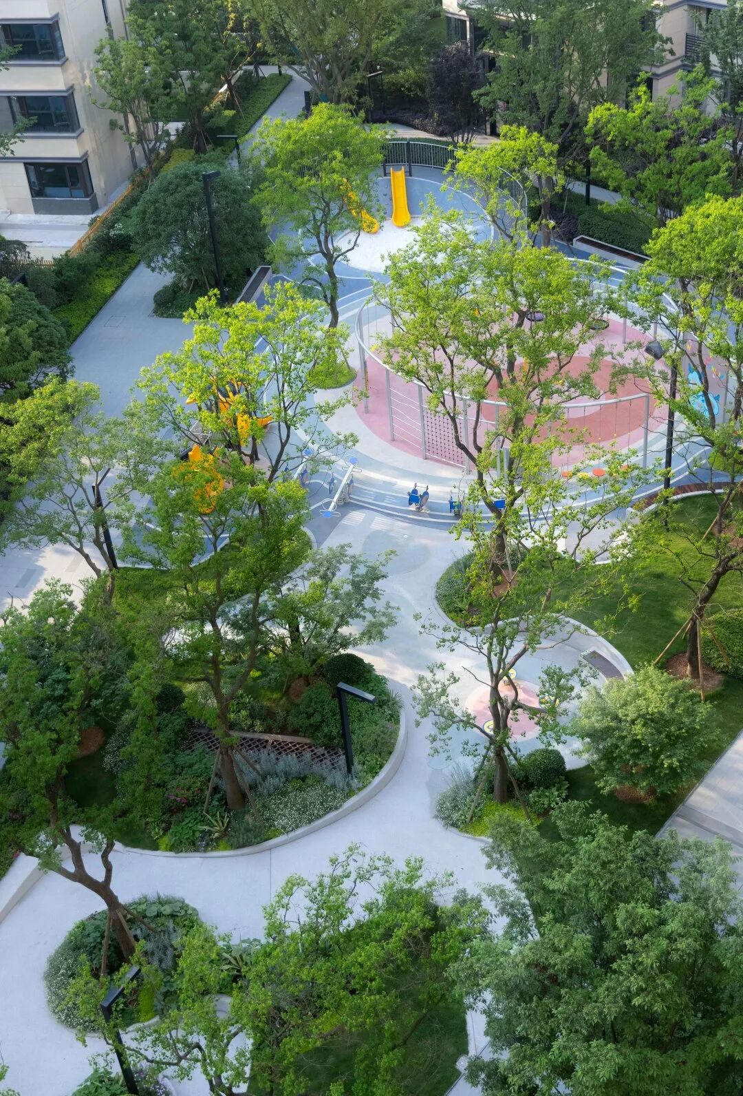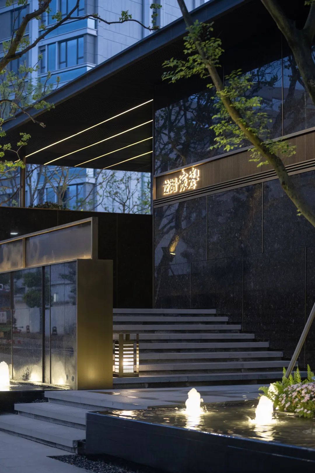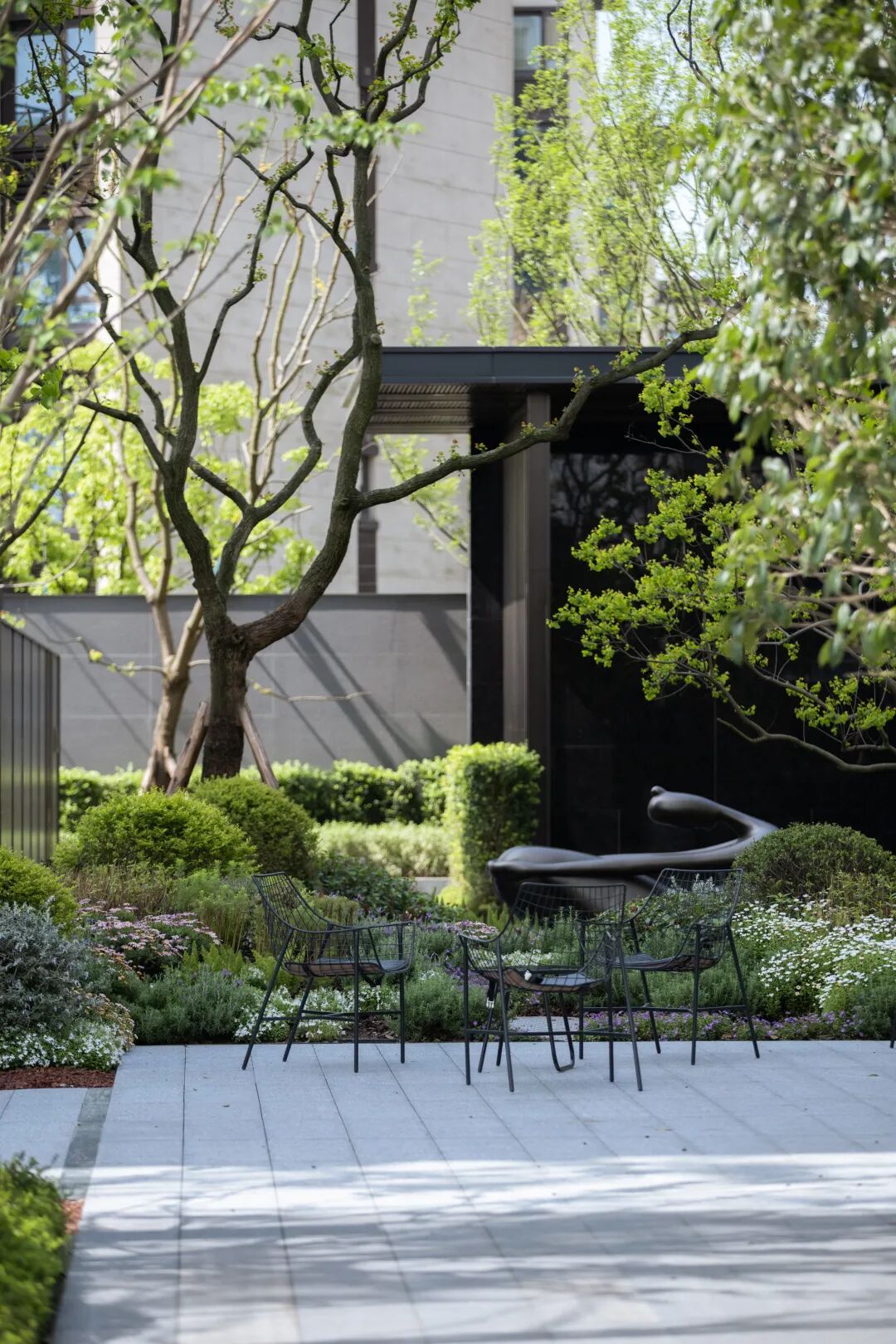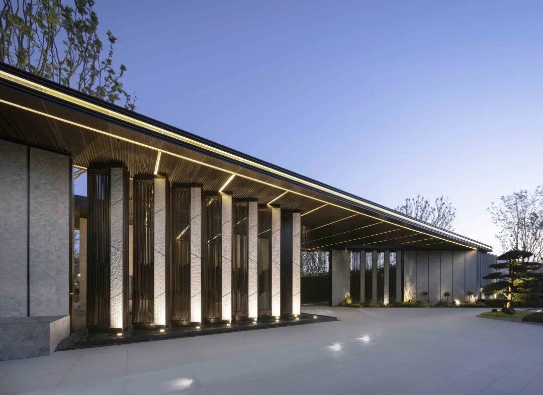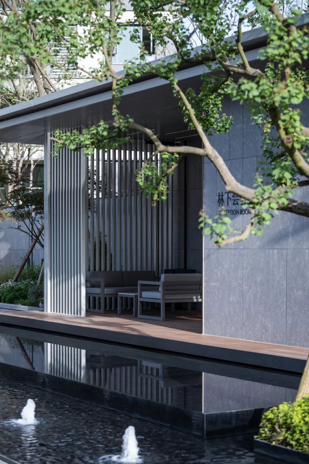 进入主入口,婀娜的乌桕光影、精致的雕塑、层层跌水、错落的花镜迎面而来,营造出无限的景深。临水而行,一处林下会客厅交错于斑驳树荫间,可赏可憩。