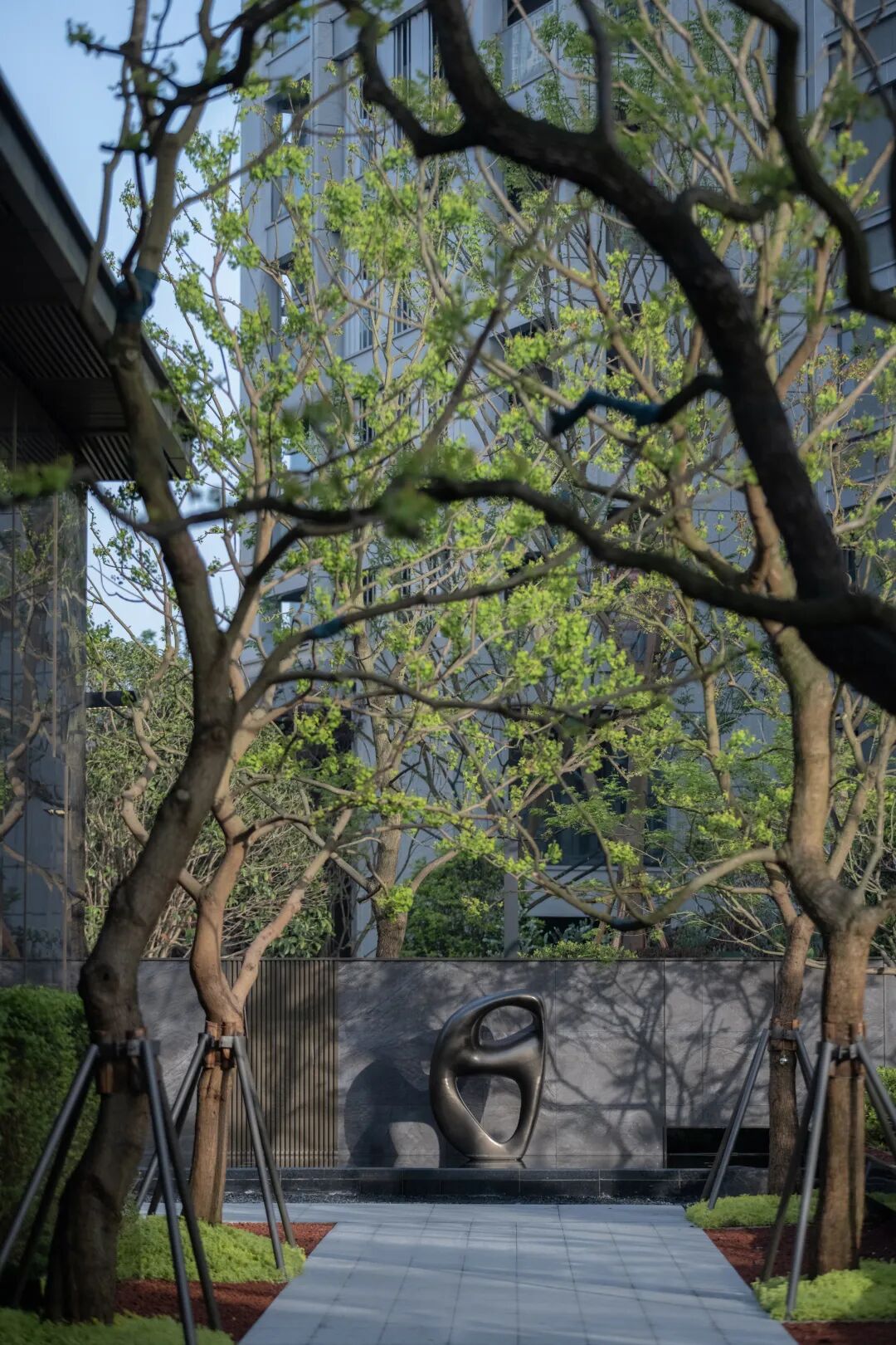 极具审美情趣的雕塑,优雅的伫立在一片绿意盎然之中,记录着时间的流淌,和两旁的乌桕林一起见证生活的点点滴滴。
