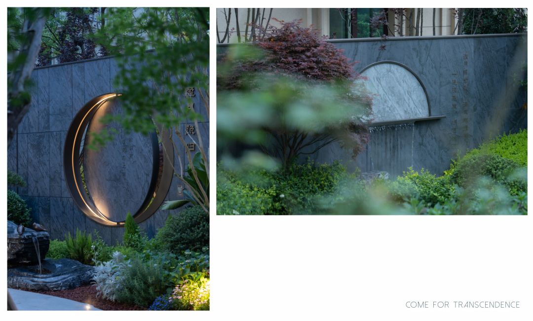 绿影浮动间,升起一方高台,天屿初现,归家礼序尽显。树影攒动,山石散置。青松掩映间,圆月印刻景墙之上。
