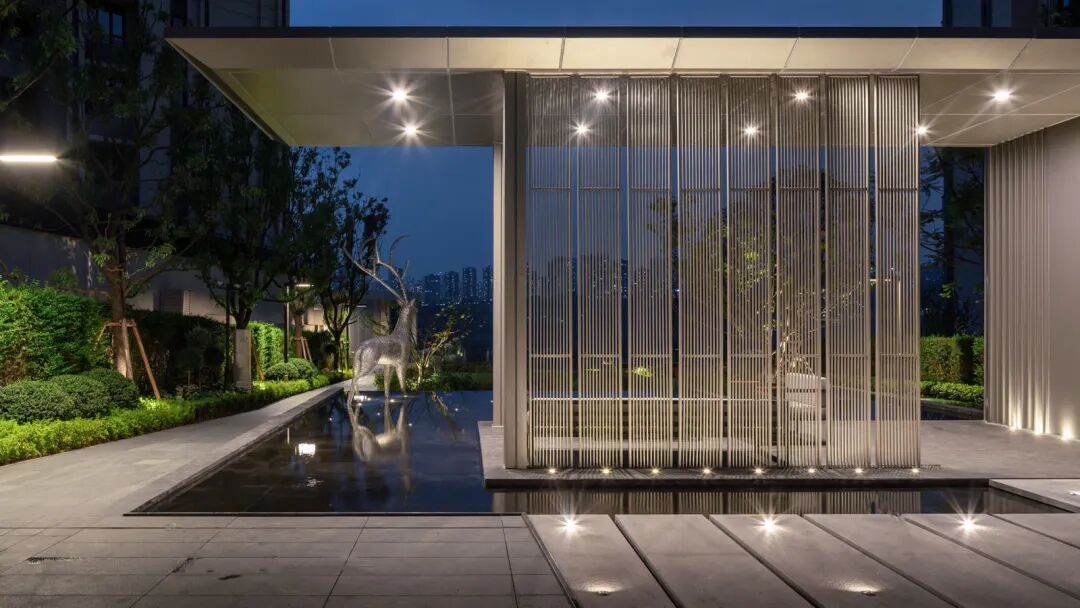 精致雕塑,叠水涌泉,随业主归家脚步顺流而下,祥鹿静水,映夕阳美景。