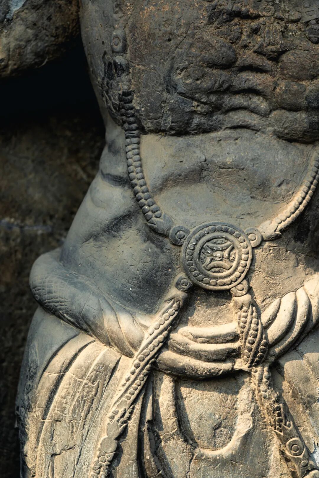 凑近了看,才发现这些指甲盖大小的石佛竟各不相同:左边这尊斜挎的袍带,到了右边即刻成了贴身的袈裟。