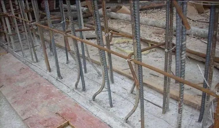 如果钢筋位移在 25mm 到 50mm 之间且向内偏,可直接在楼面上按 1:6 比例调整钢筋,保证模板支设,同时采取钢筋根部绑扎和点焊钢筋的方法进行加固,加筋的直径为 14,加筋需要与打弯的钢筋绑扎搭接在一起。