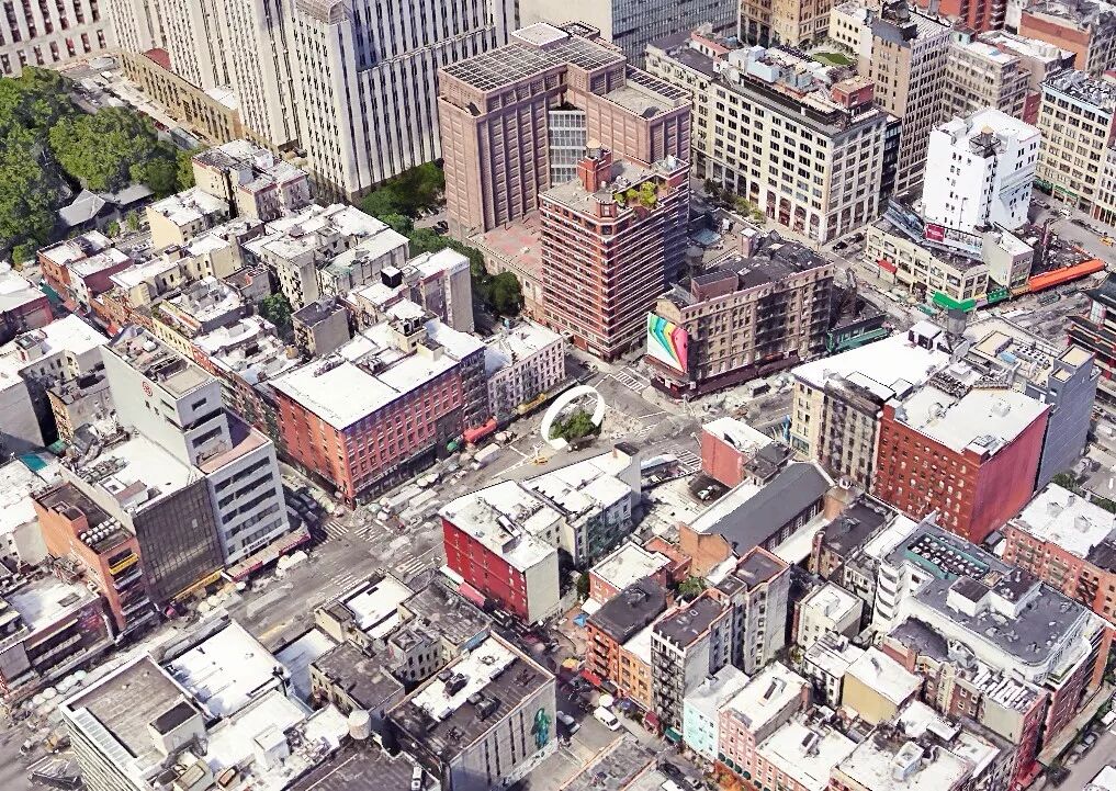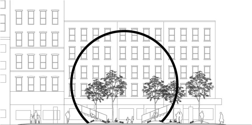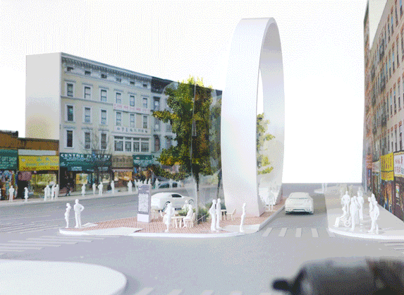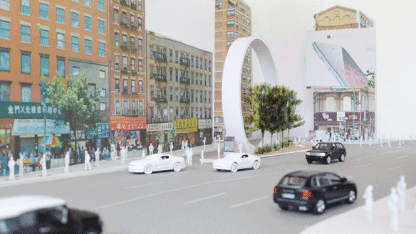 拱门两侧的露天看台座位汇集了一个用于文化活动的遮蔽广场。位于运河街三角区的花园中有两个信息图腾,利用现有的成功WalkNYC寻路系统,同时为当地社区提供英语,普通话和广东话的定制显示。
